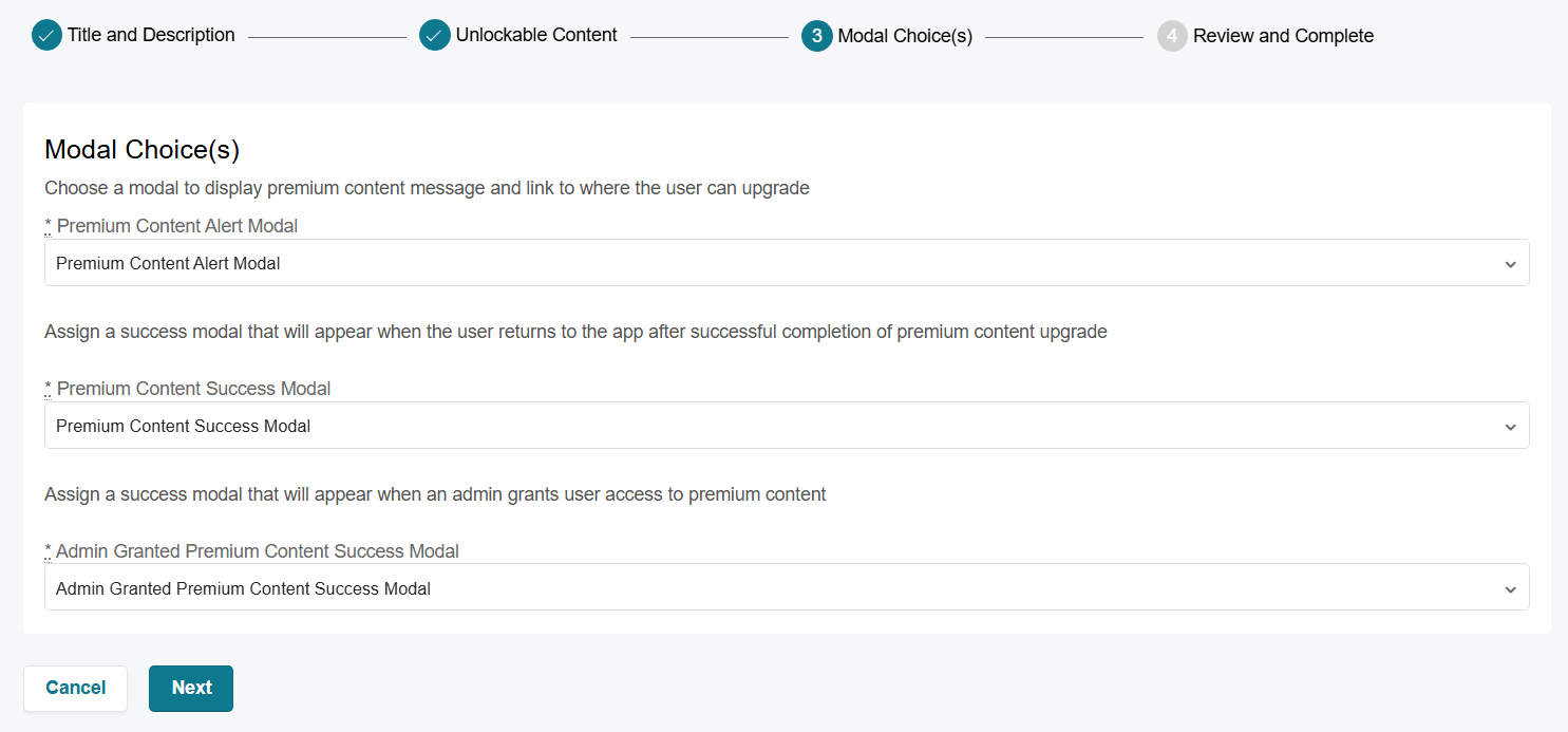 - Select which modals will appear for your Alert Modal, Success Modal, and Admin Granted Success Modal. Click on Next.