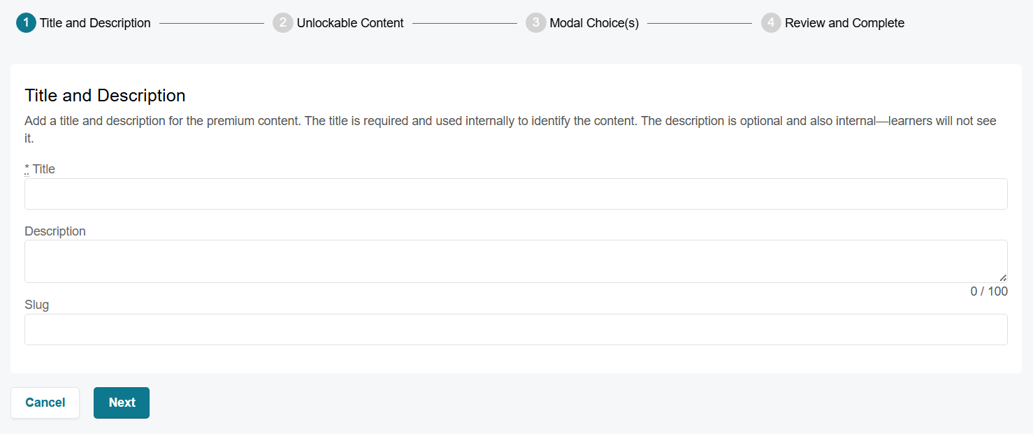 - Input a title, description (optional), and slug. The title and description are internal fields, so learners will not see these. Click on Next.