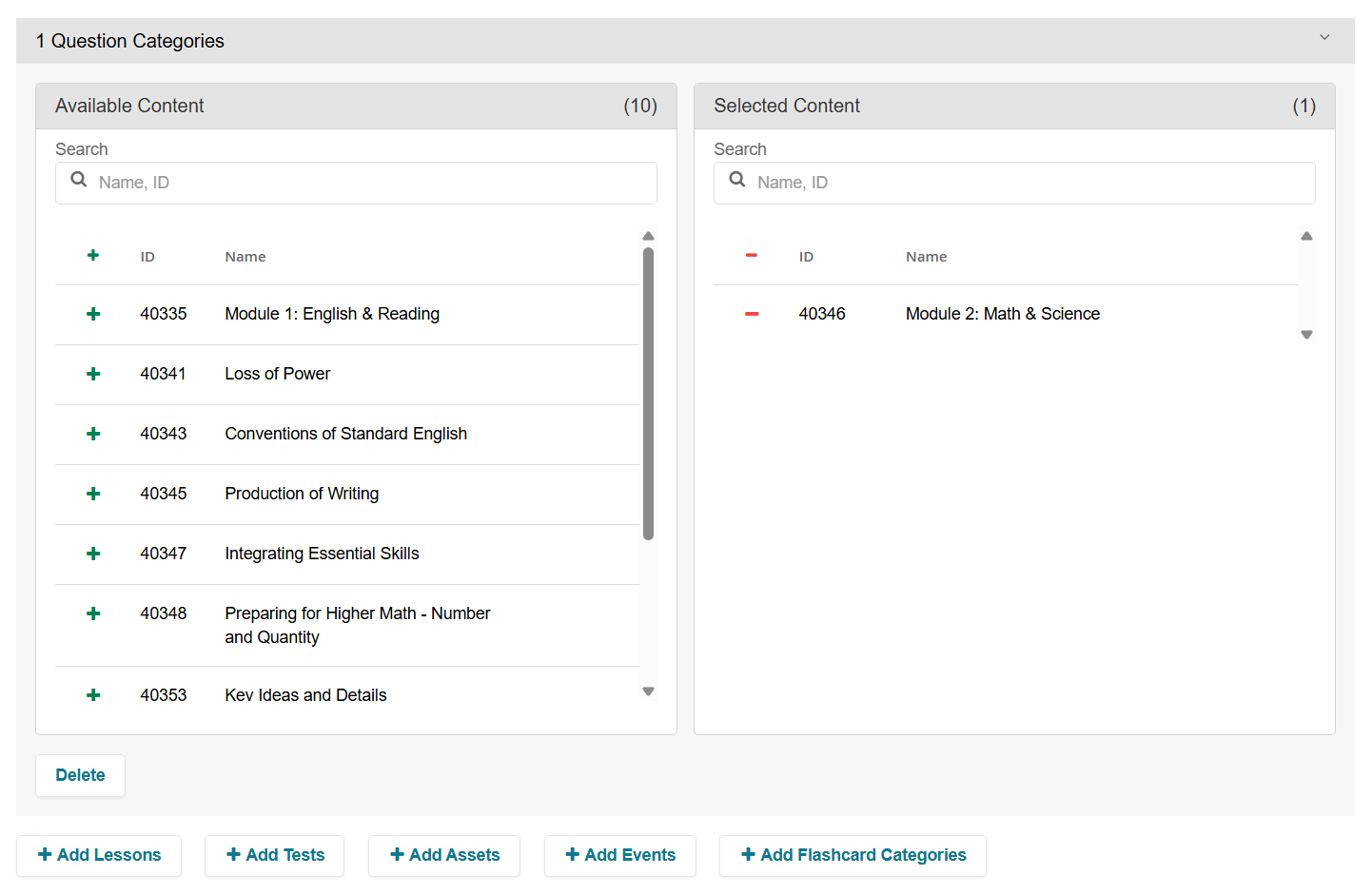 NOTE: If your course does not use a content type, no content will appear when attempting to add that criteria (e.g. If you have no tests in your course, clicking on + Add Tests will display no results).- Move content from the Available Content to the Selected Content section by clicking on the + icon next to an item. Selecting the - icon will remove the item from the selected content side.