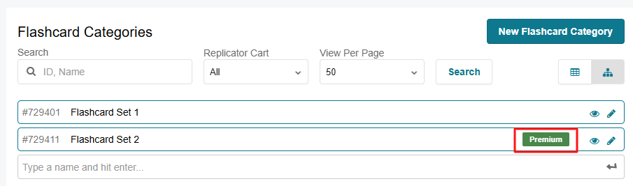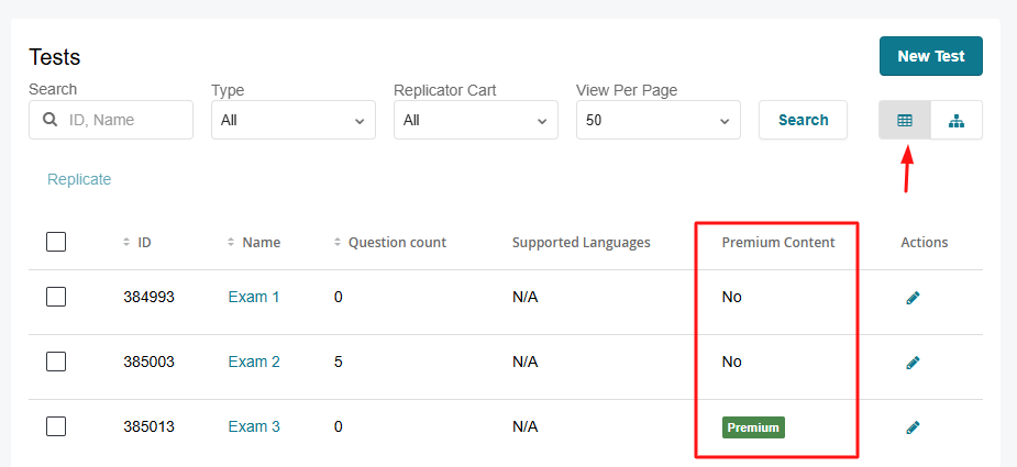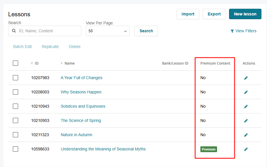 In Lessons and table views of Flashcards, Tests, and Assets, premium items are marked with a green label in the “Premium Content” column of the table.