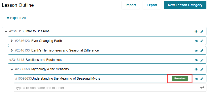 In BluePrint, premium content is marked with a green “Premium” label displayed on the right-hand side in Lesson Outlines and tree view for Question Categories, Flashcard Categories, and Tests.