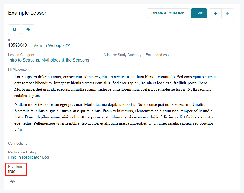 On Detail pages for Lessons, Question Categories, Flashcard Sets, Assets, and Tests, premium content is indicated by the Premium Content field. The field displays “true” or “false”, with true meaning the content is premium.