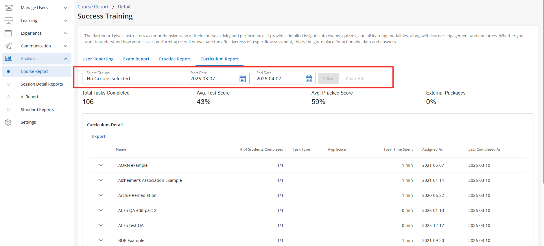 The Curriculum Table above and all sub-feature data points can be filtered by group and date. By default the filter displays the last 30 days.