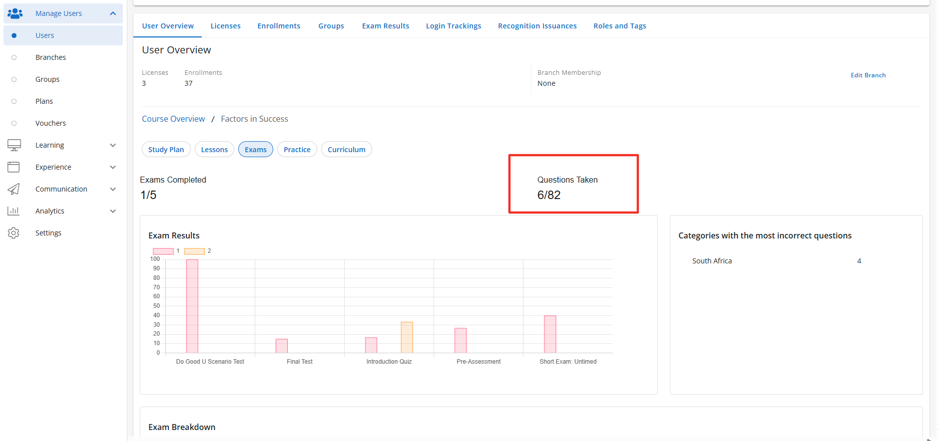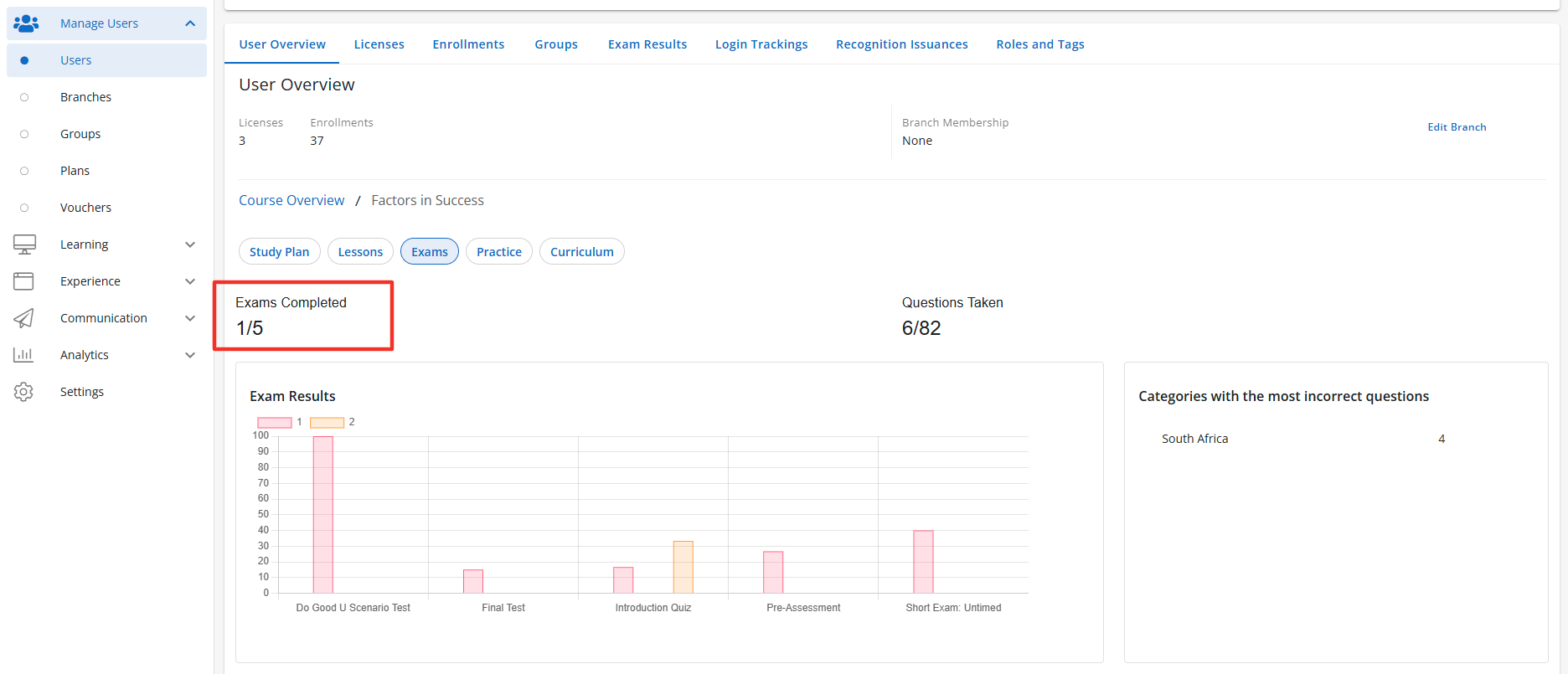 Select any course to view more data about learners associated with the course. Once you have selected a course the User Report Tab, Exam Report Tab, and the Practice Report Tab will display when enabled. To learn more about managing these features click here.