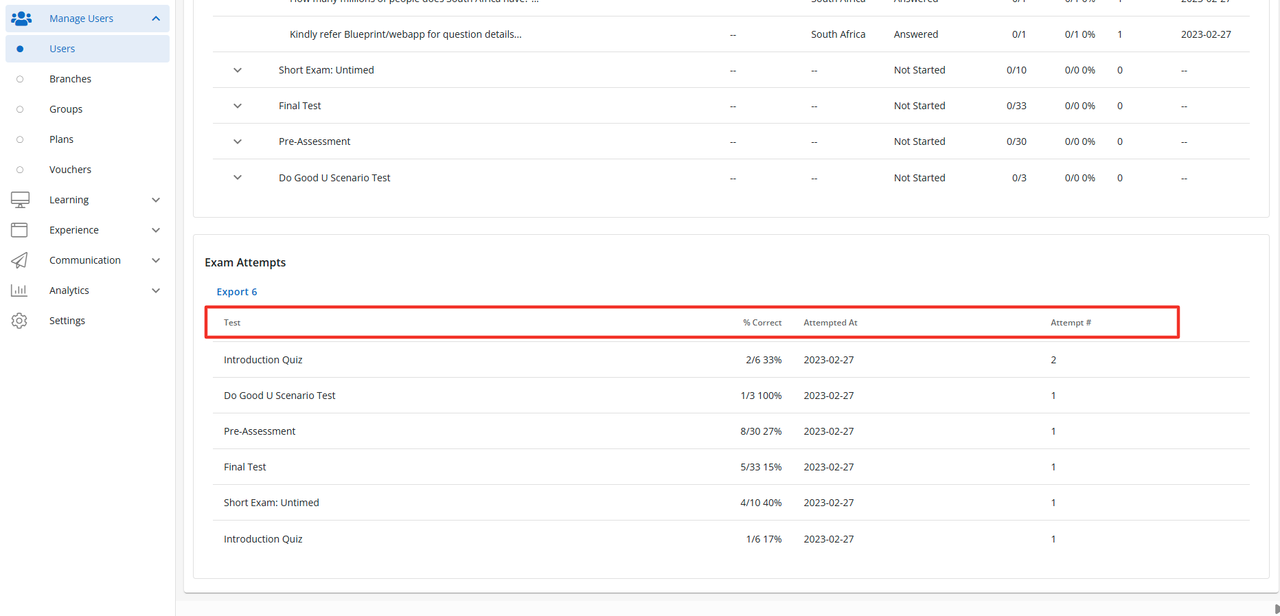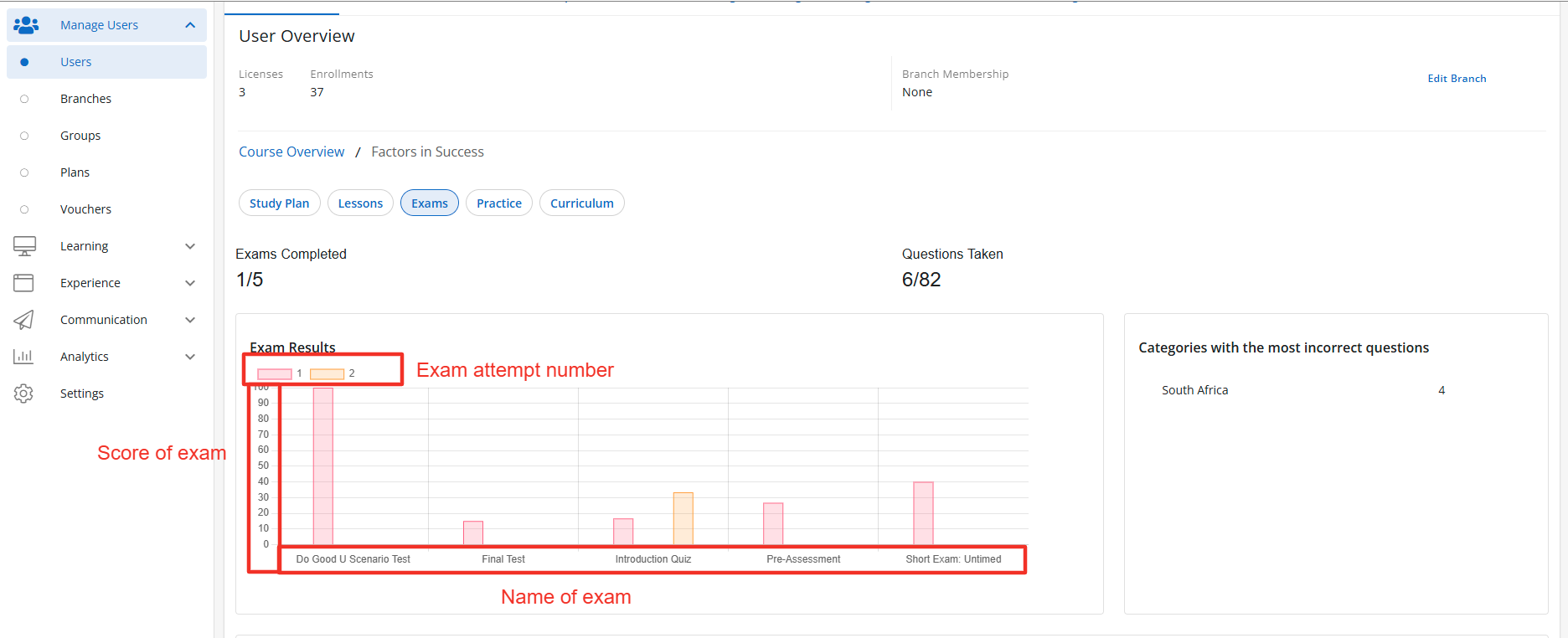 The Exam Report User Attempt Chart is a sub-feature of the Exam Report Tab, to learn more about how to manage this feature please click here.