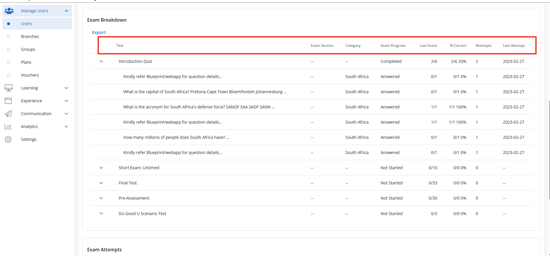 When you expand the Exams it will display questions the users have taken when expanded. These questions display the same columns as the Exam Report Table.
