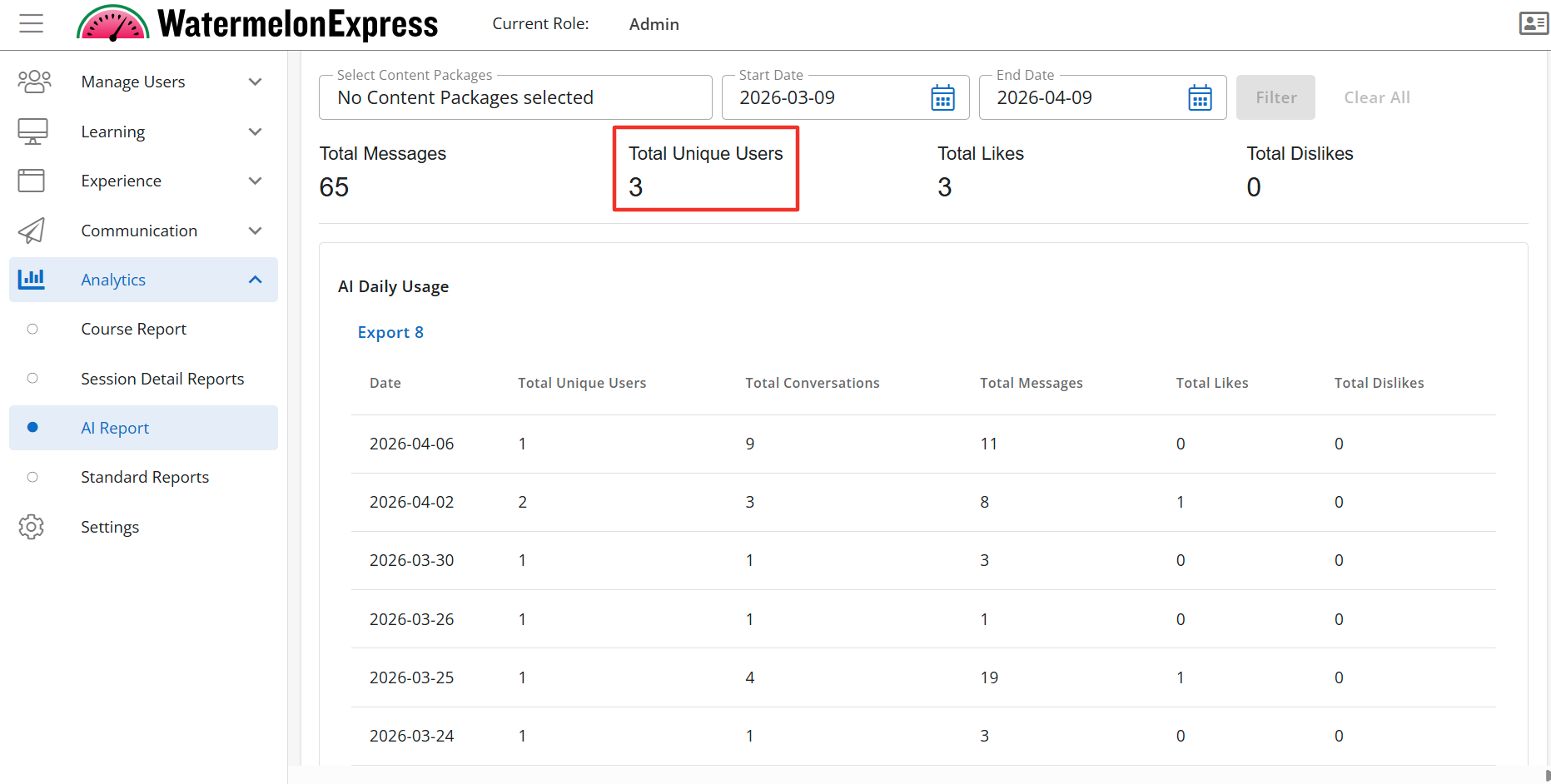 The AI Usage Report - Total Unique Users Data Point will display the Total Unique Users widget. The Total Unique Users is the total number of different/unique learners that engaged with the AI Assistant. The Total Unique Users displays above the AI Daily Usage table if enabled.