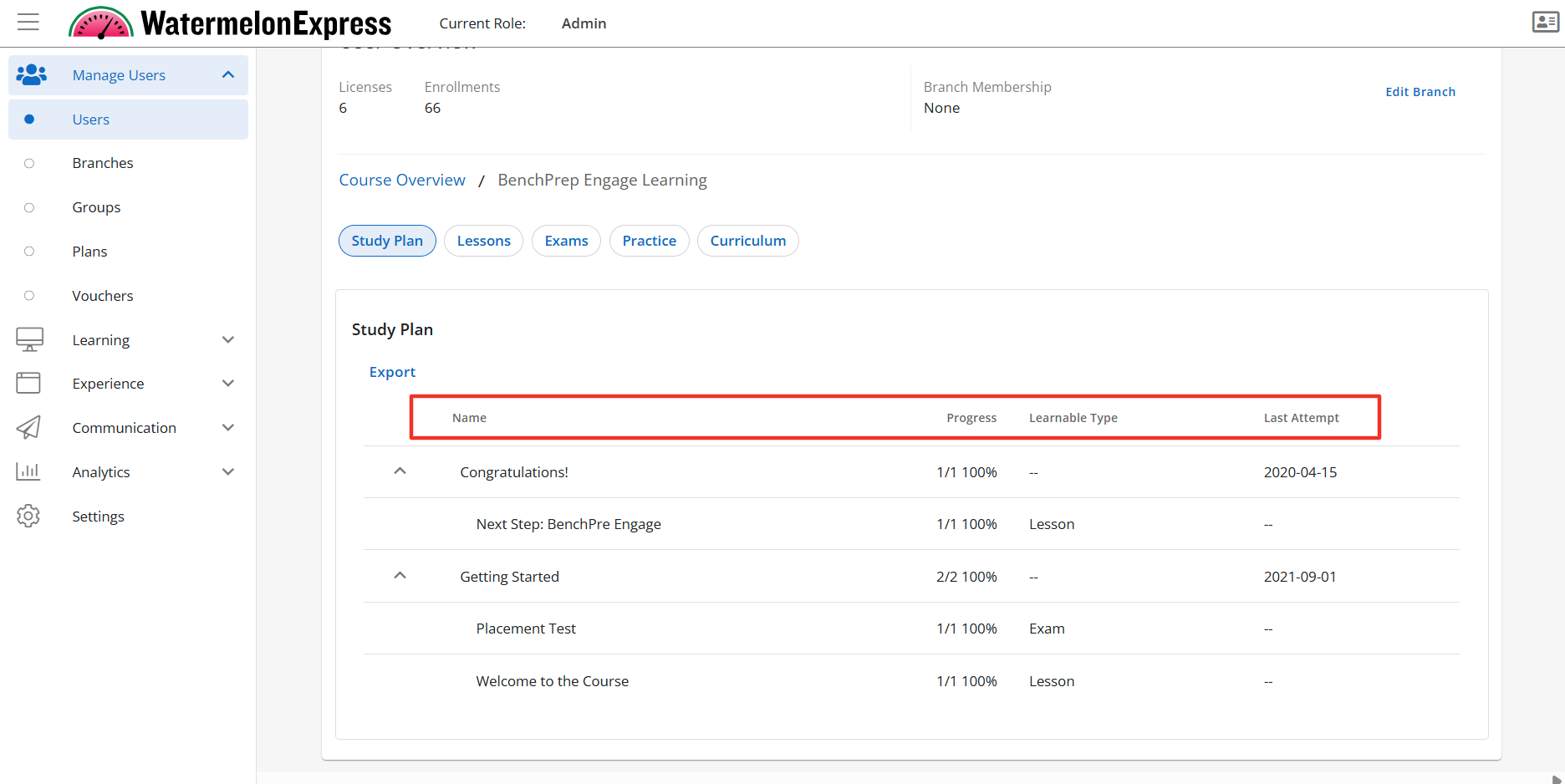 - Last Attempt - Displays the date a learner within your scope context last attempted the exam.