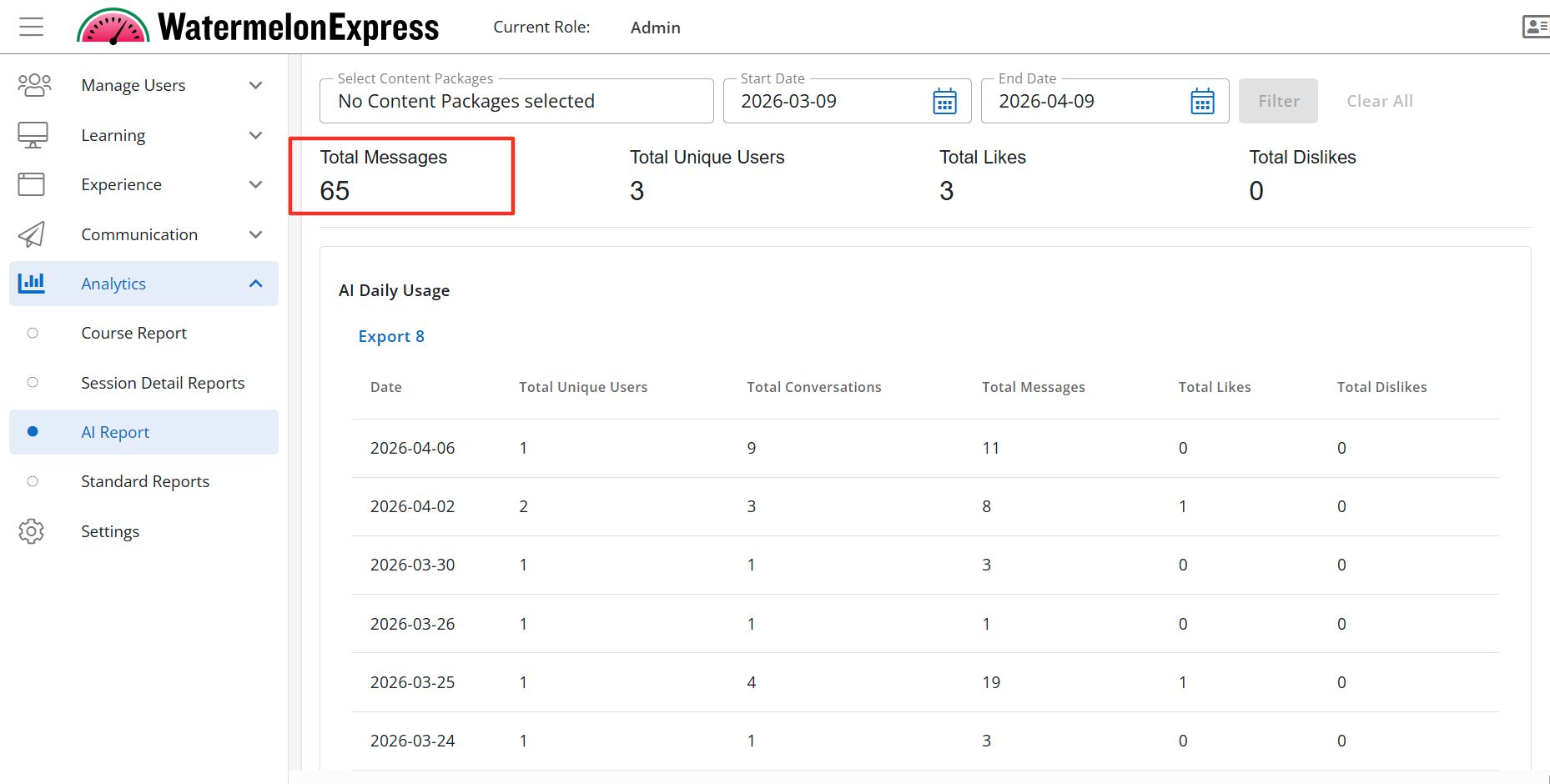 The AI Usage Report - Total Messages Data Point will display the Total Messages widget. The Total Messages is the total number of messages learners sent while using the AI Assistant. The Total Messages displays above the AI Daily Usage table if enabled.