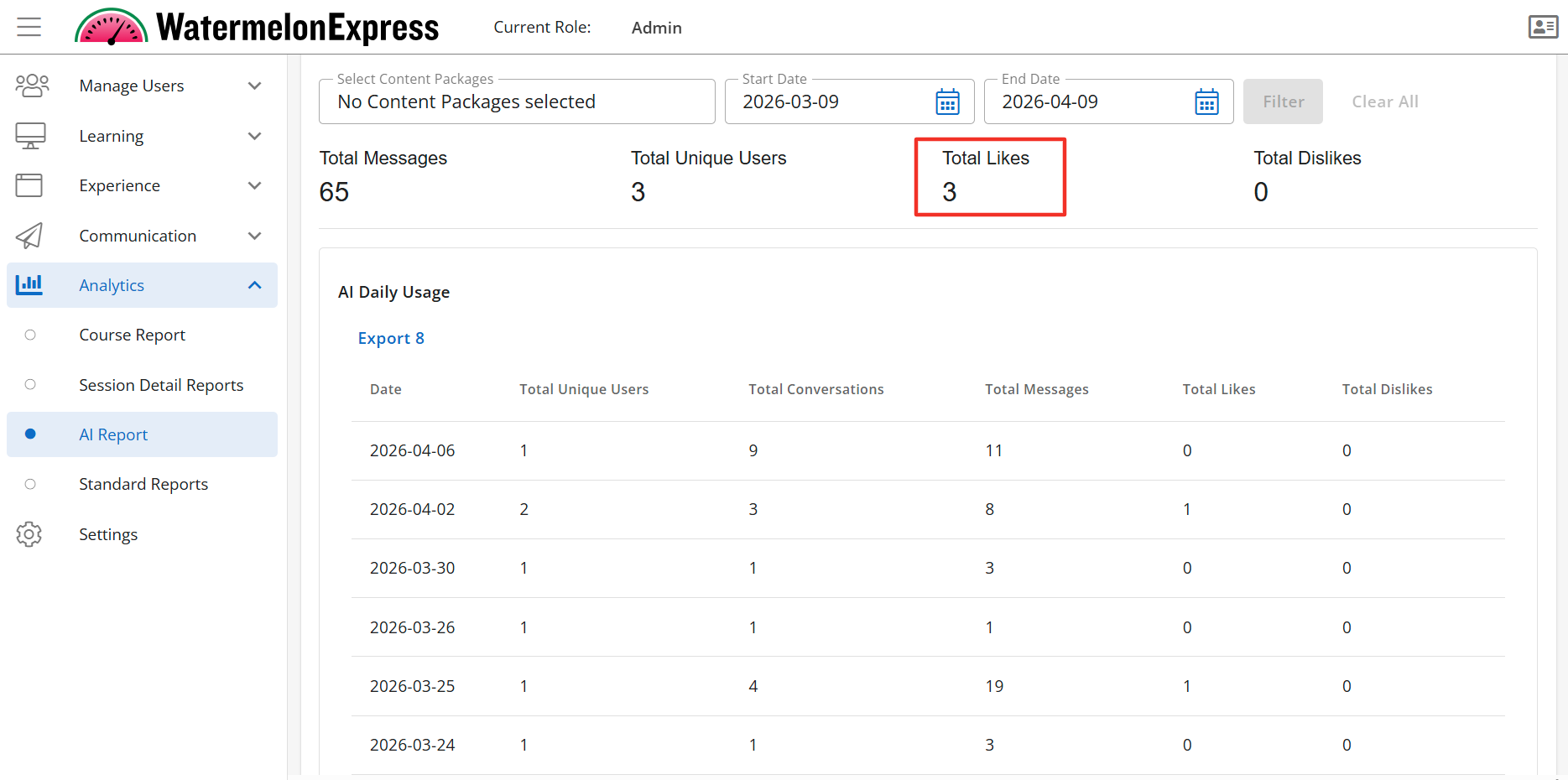 The AI Usage Report - Total Likes Data Point will display the Total Likes widget. The Total Likes is the total number of likes a response received while a learner was engaged with the AI Assistant. The Total Likes displays above the AI Daily Usage table if enabled.