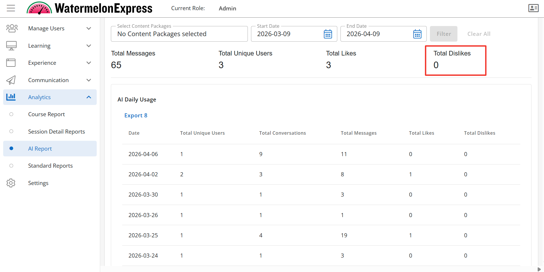 The AI Usage Report - Total Dislikes Data Point is a sub-feature of the AI Report tab. To learn more about how to manage this sub-feature click here.