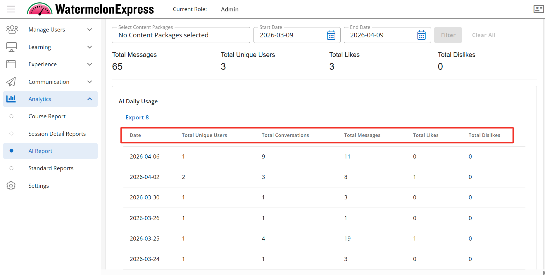 The AI Daily Usage Table is a sub-feature of the AI Report tab. To learn more about how to manage this sub-feature click here.