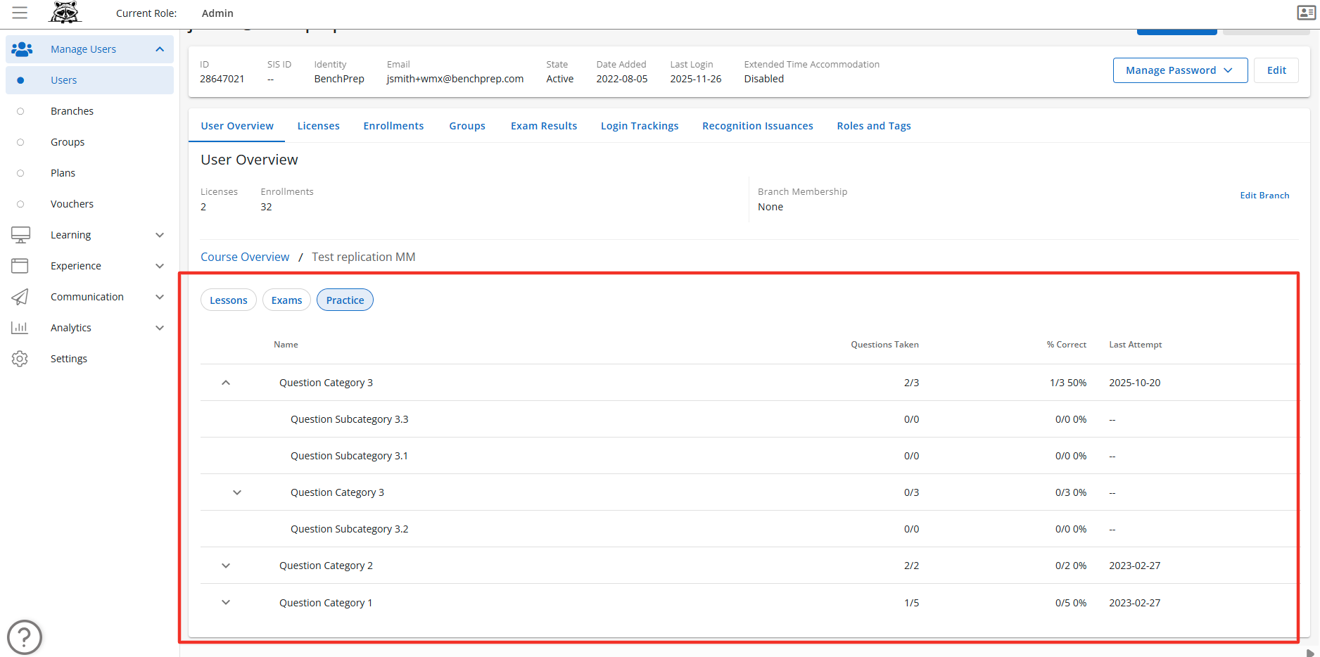- Last Attempt - The date the user last attempted Practice questions in the Question Category or Sub Category.