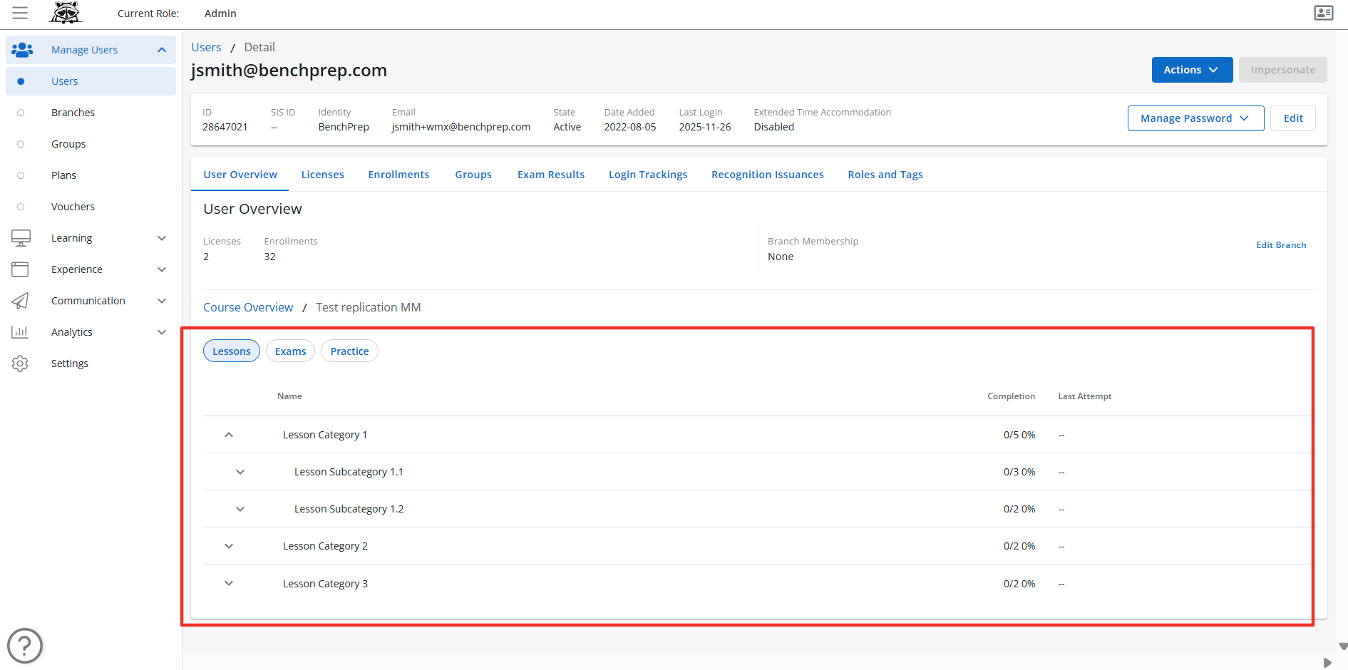 Once selected the User’s Detail page will display an overview of the learner's licenses and the number of their enrollments, Exam Results and other data. To view additional details about the User Detail page click here.