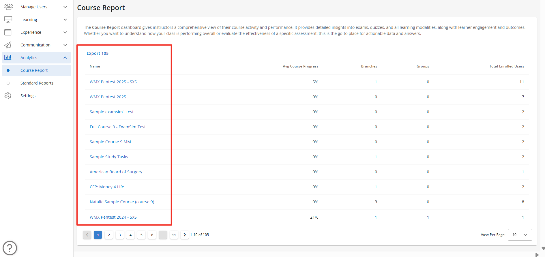 The Course Report dashboard gives a comprehensive view of course activity and performance. It provides detailed insights into exams, quizzes, and all learning modalities, along with learner engagement and outcomes.
