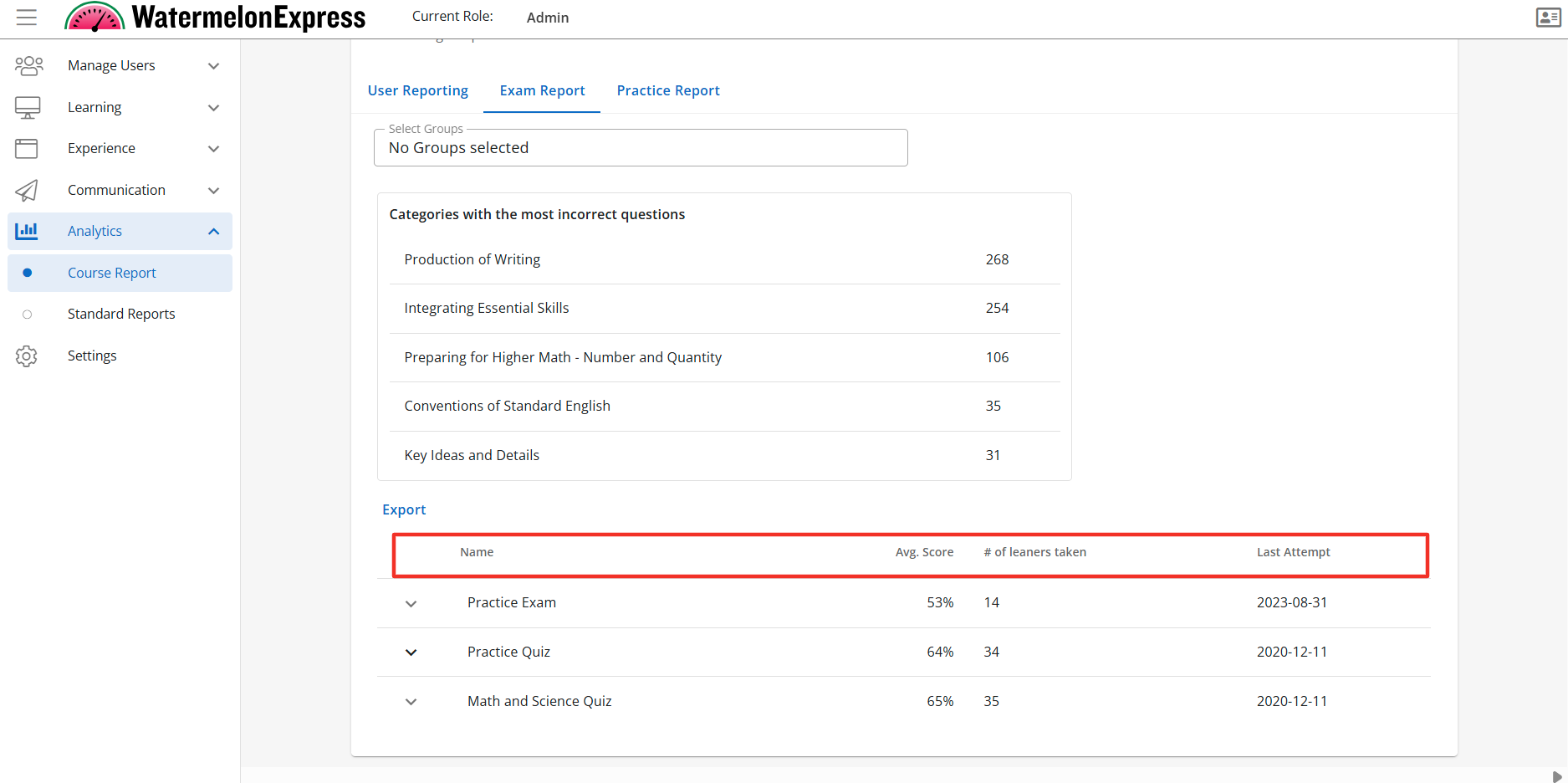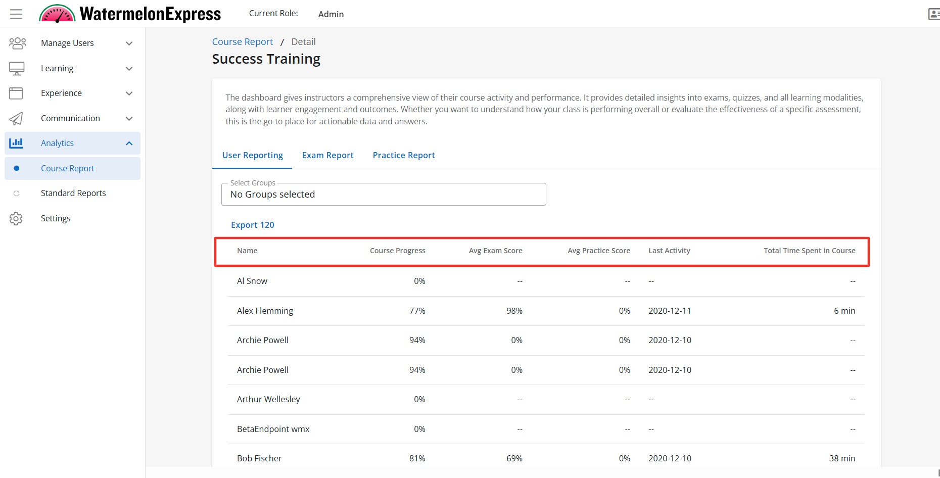 Select any course to view more data about learners associated with the course. Once you have selected a course the User Report Tab, Exam Report Tab, and the Practice Report Tab will display when enabled. To learn more about managing these features click here.