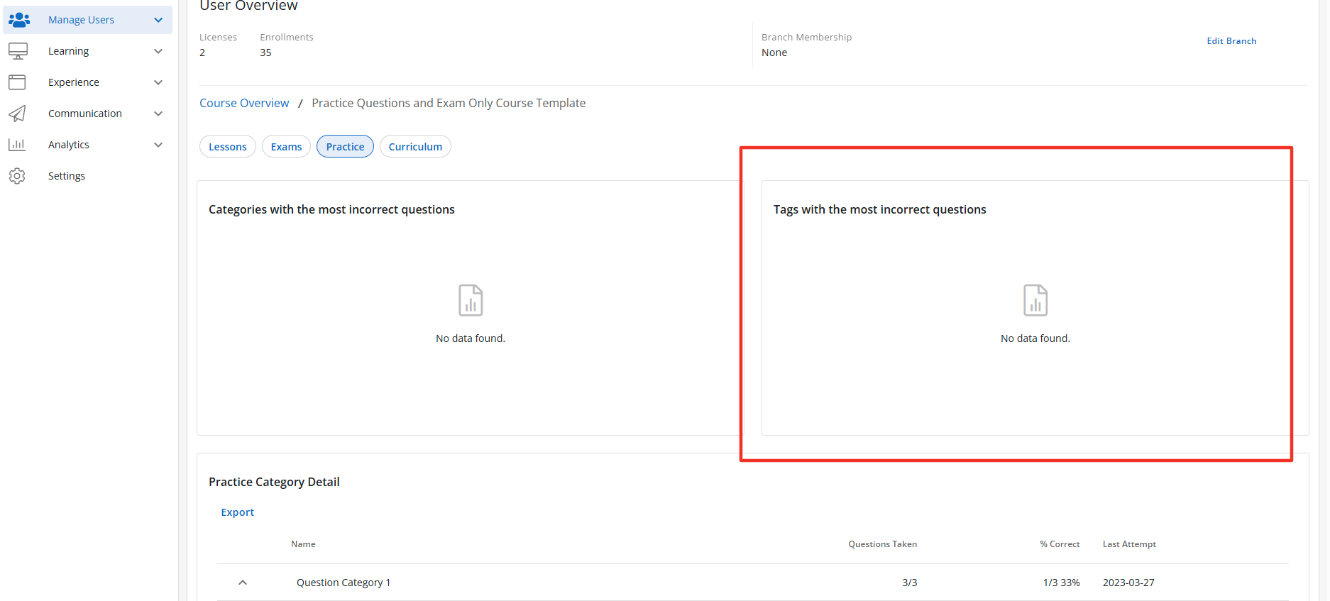 The Practice Report Tab is a sub-feature of the Course Overview Tab, and the Practice Report Table is a sub-feature of the Exam Report Tab to learn more about how to manage these features please click here.