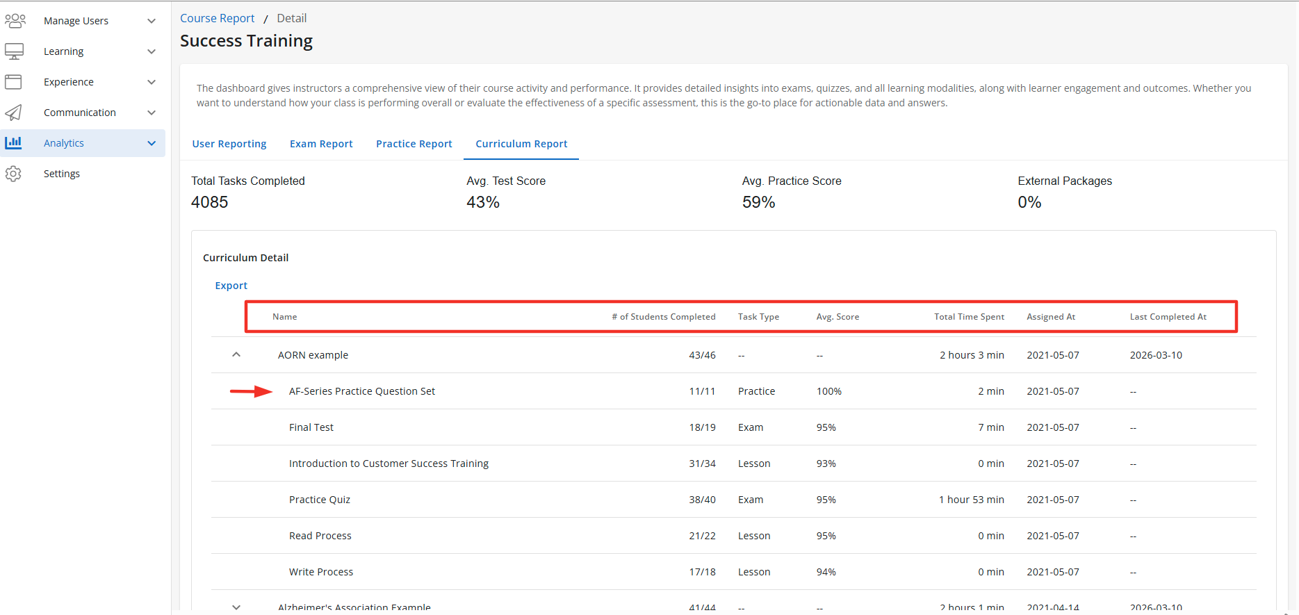 The Curriculum Tab will also display the Average Practice Score of the learner. The percentage shown is the average score the leaner received after completing any practice questions within the curriculum.