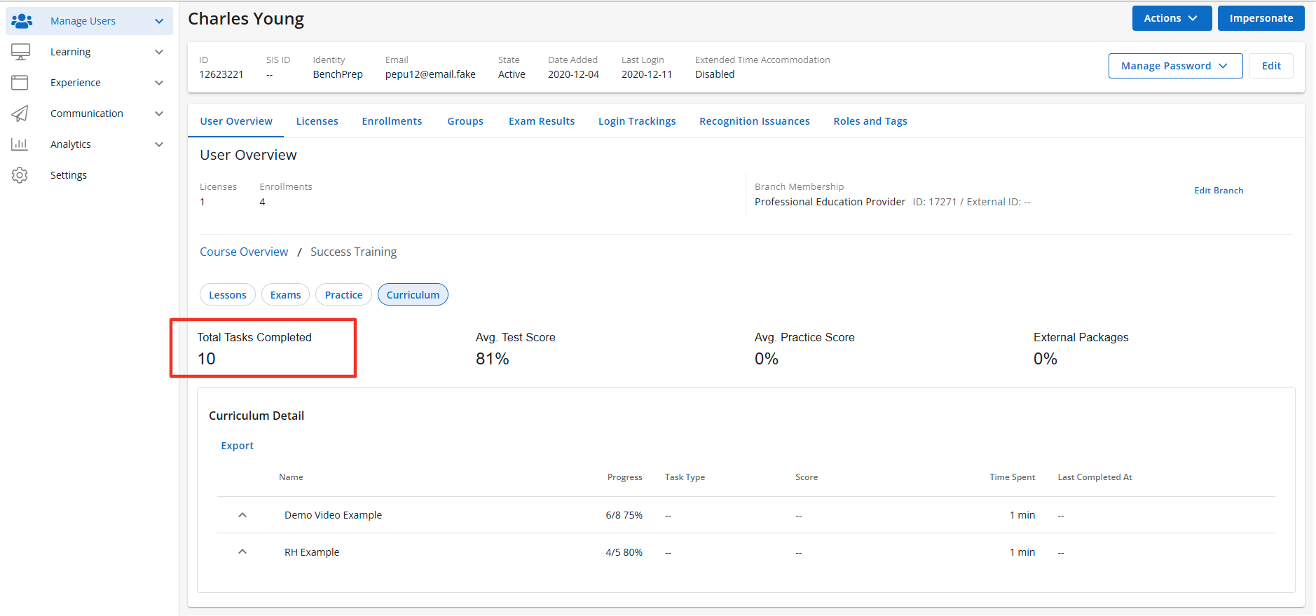 - The Course Overview section of the User Detail page shows progress and performance data at the user level for any learners you have permission to view. The dashboard includes metrics such as total enrollments, average test scores, course progress, and more.