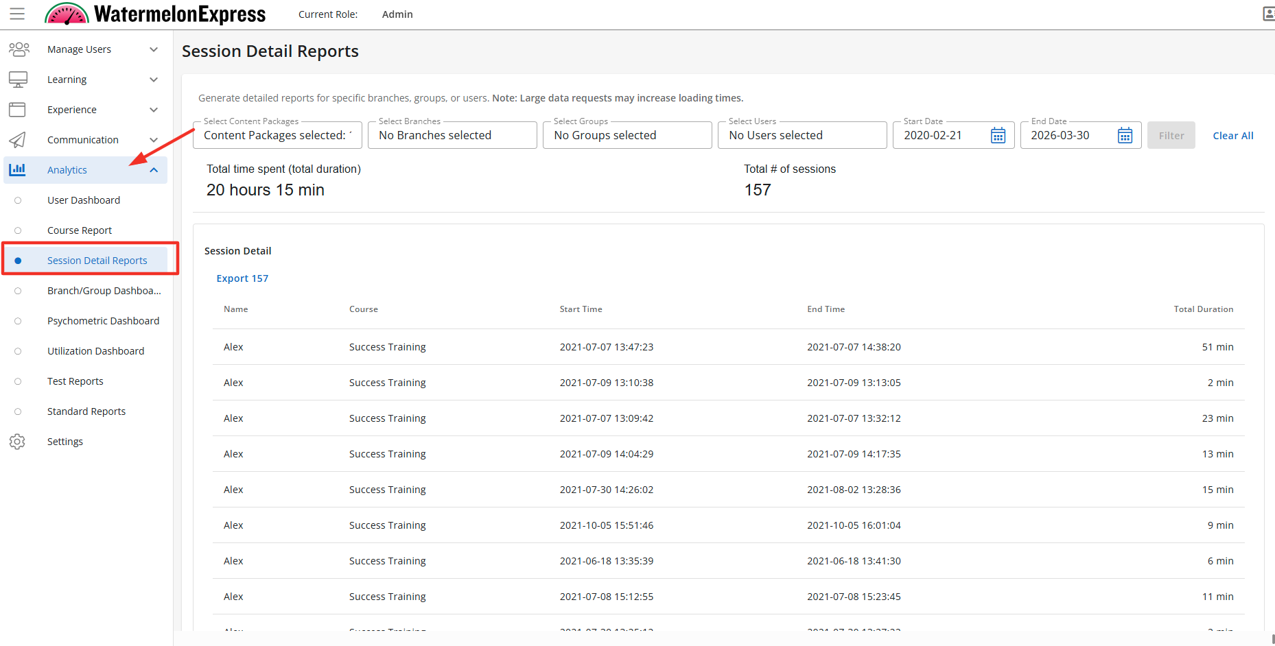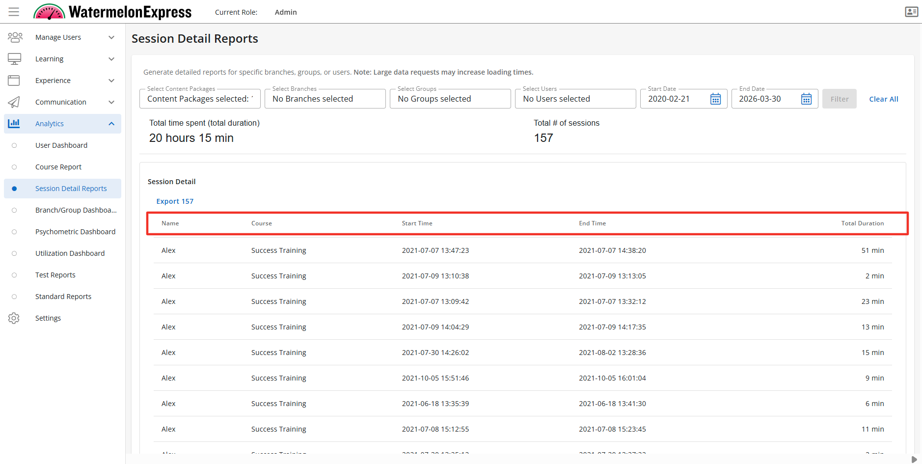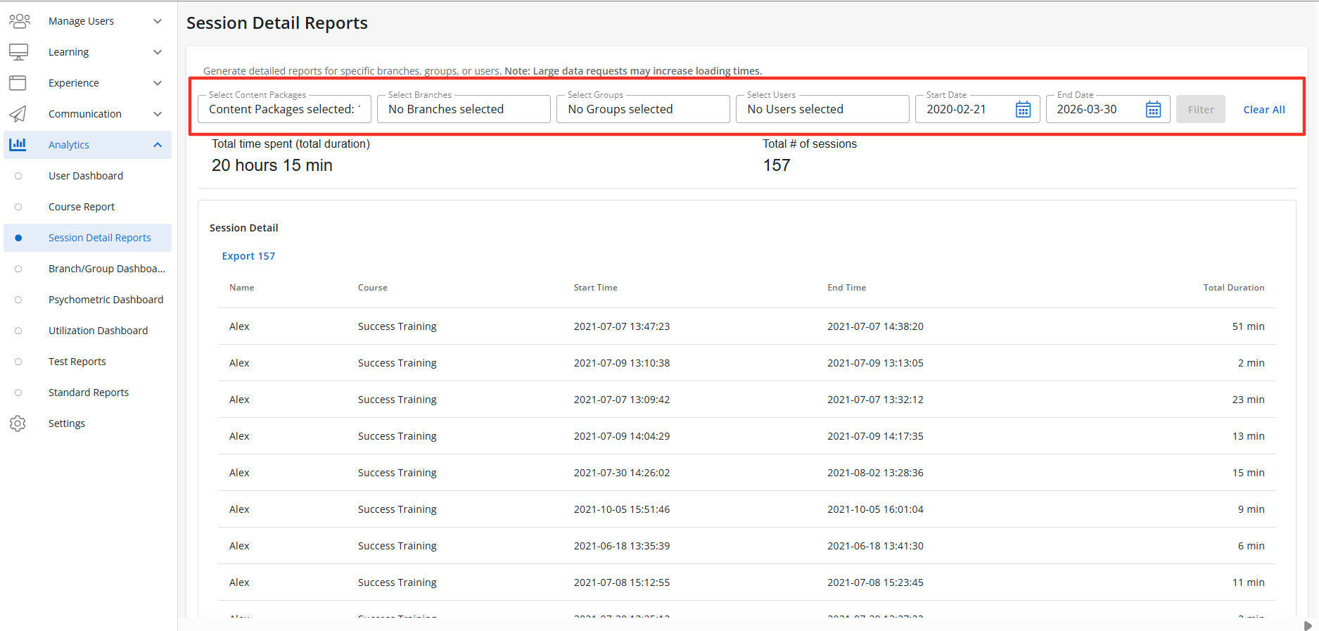 - The Sessions Detail Report dashboard houses the Session Report Table. When the Sessions Report Table is enable it displays every time a learner accesses the platform, which course they open, and for how long the learner was in the course.