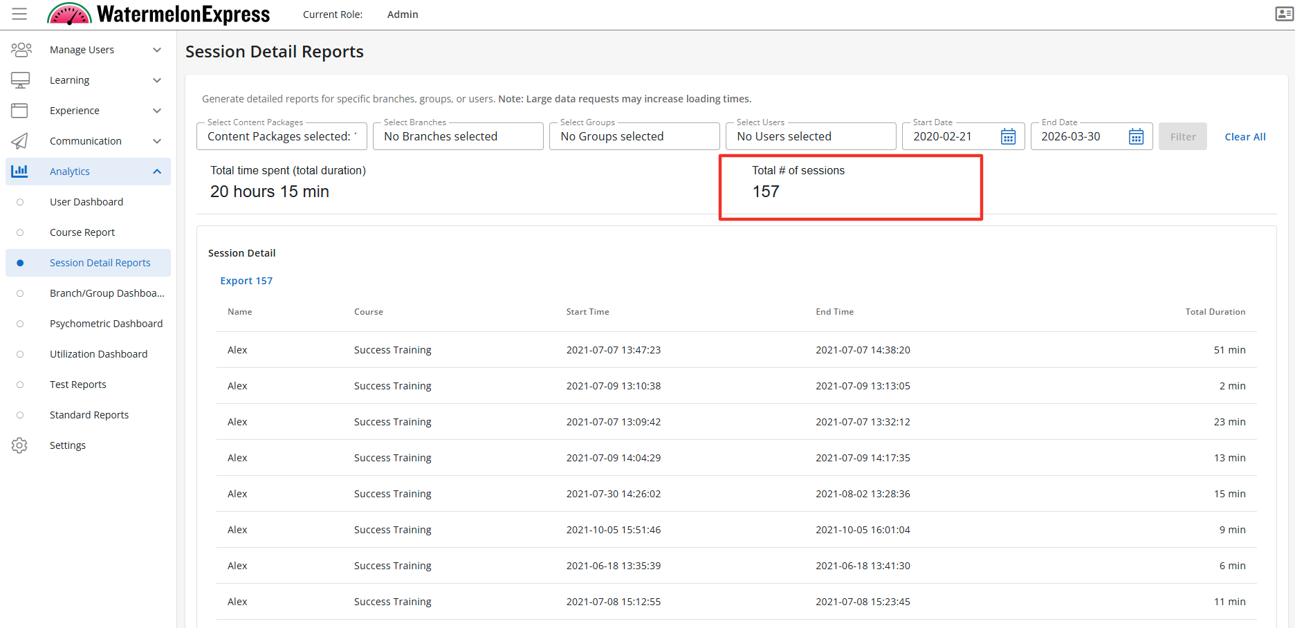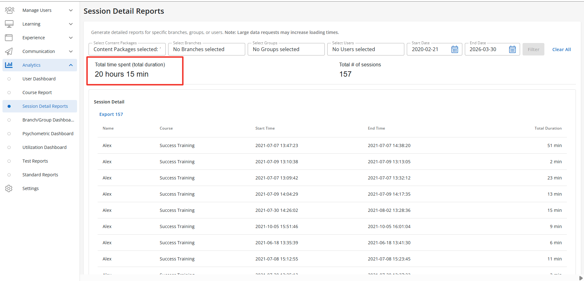 The Total Time Spent will display the total duration for all sessions for all users. This time is displayed in hours and minutes and will display above the Sessions Details Table.