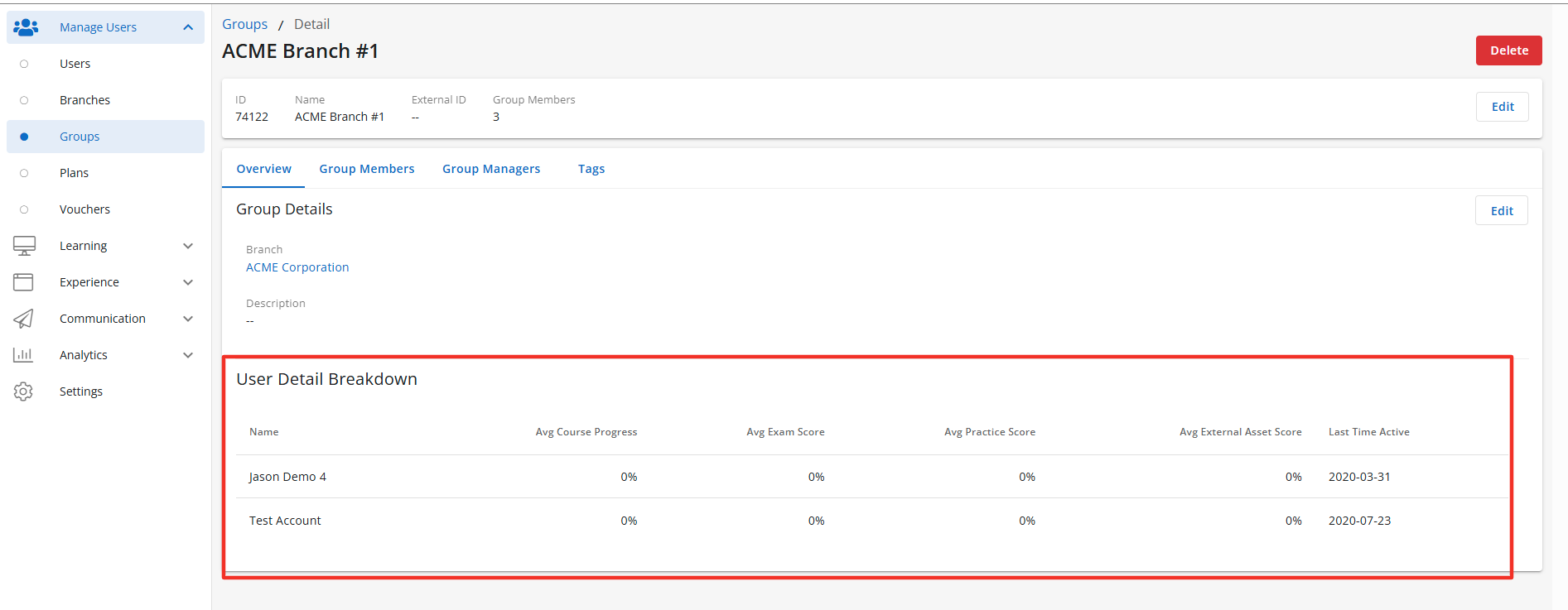 Below the Branch membership the group’s user data will display in the User Details Breakdown section.