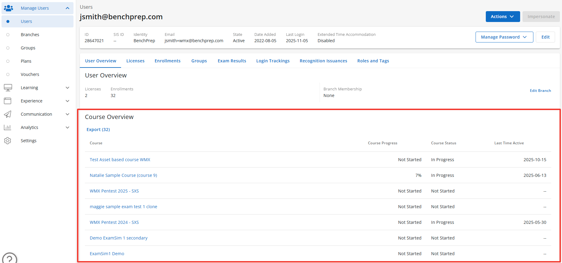 The Course Overview section of the User Detail page shows progress and performance data at the user level for any learners you have permission to view. The dashboard includes metrics such as total enrollments, average test scores, course progress, and more.