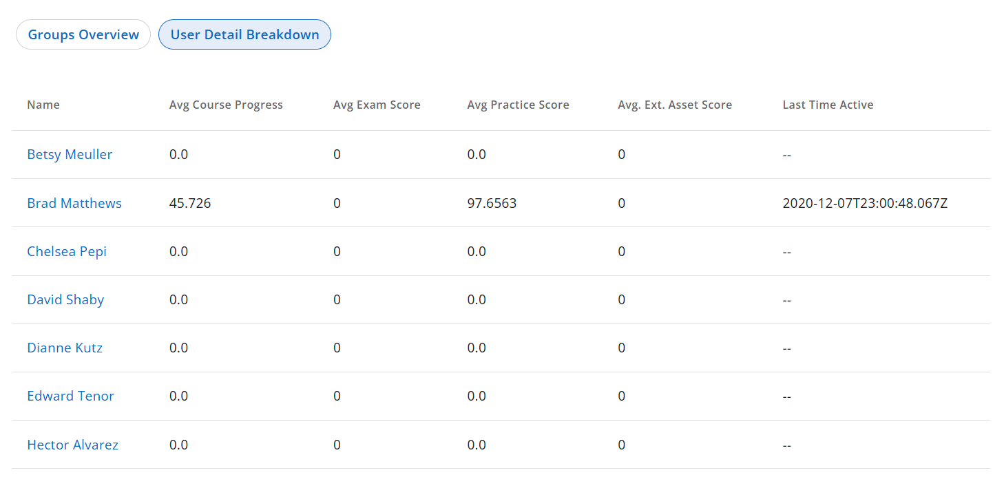 - Last Time Active - Displays the last time a learner completed an activity in the selected group. An activity consists of taking action (i.e. completing, creating, editing, or deleting) for one of the following: