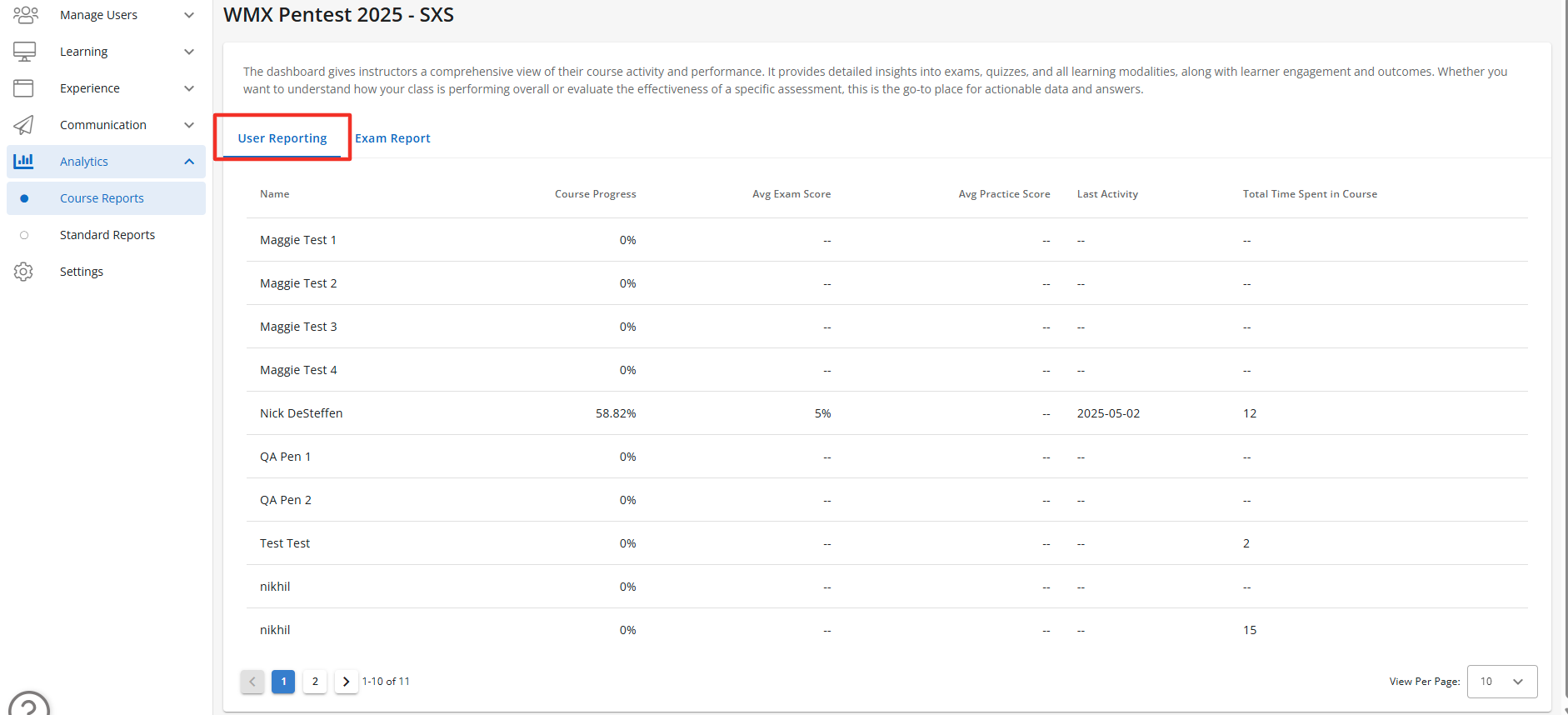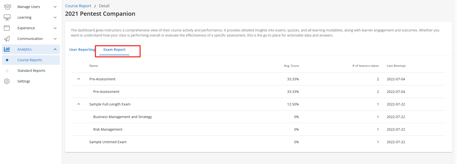 The Course Report dashboard gives a comprehensive view of course activity and performance. It provides detailed insights into exams, quizzes, and all learning modalities, along with learner engagement and outcomes.