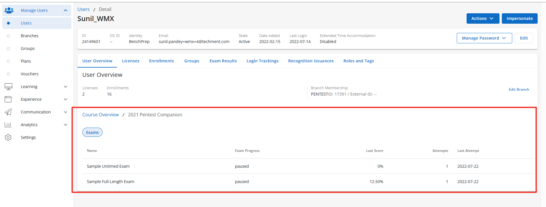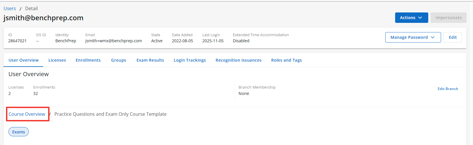 Once selected the User’s Detail page will display an overview of the learner's licenses and the number of their enrollments, Exam Results and other data. To view additional details about the User Detail page click here.