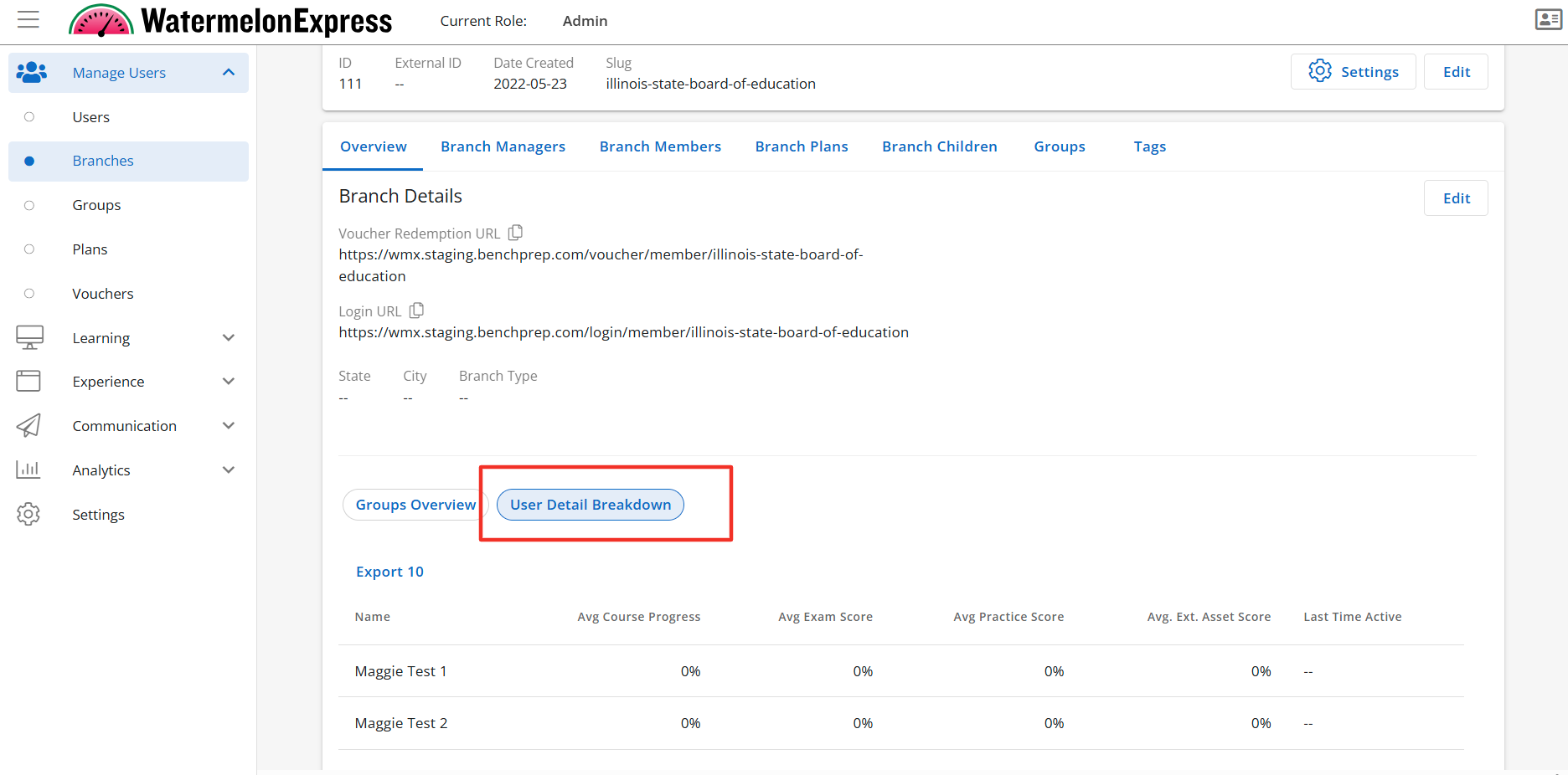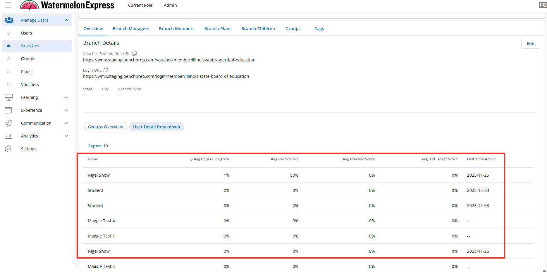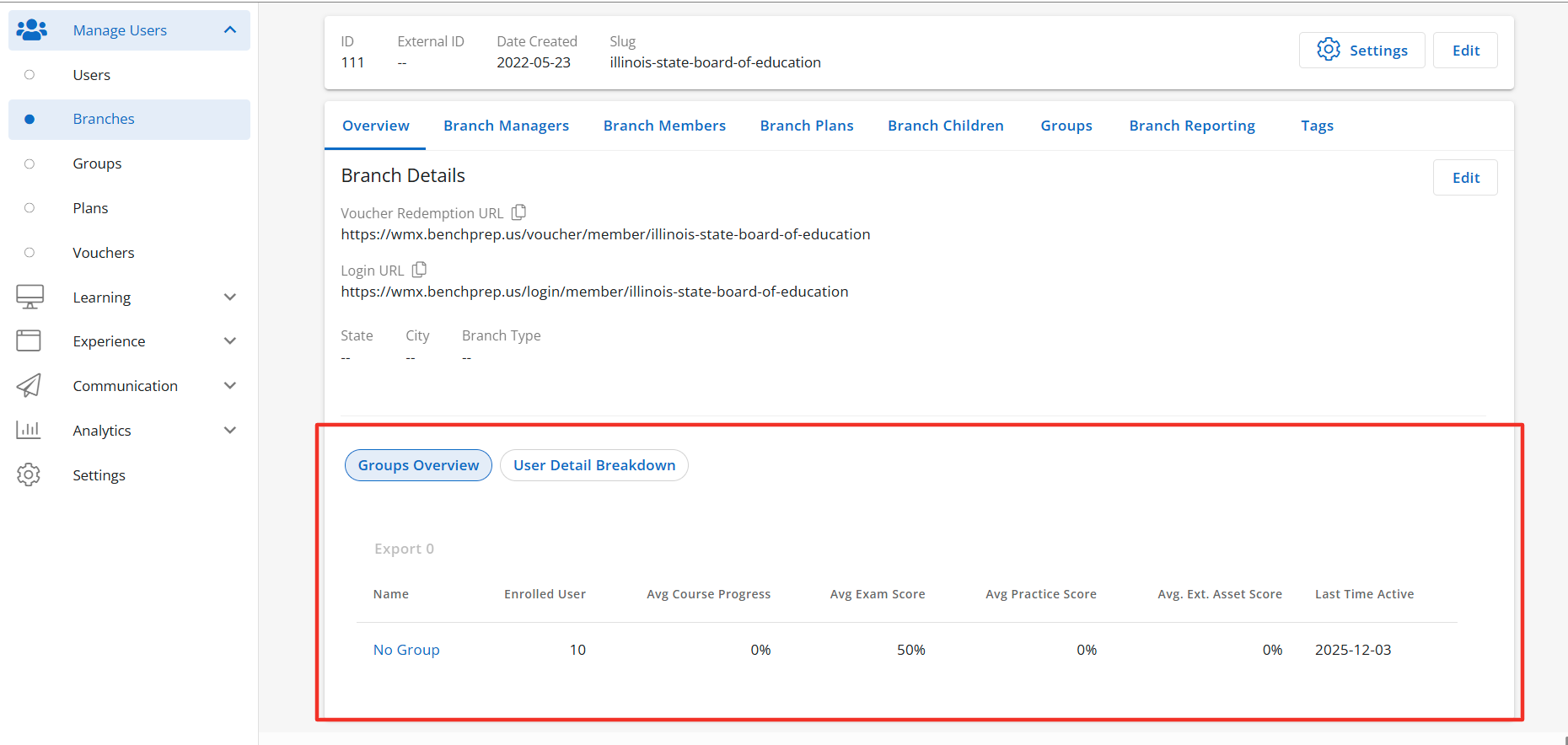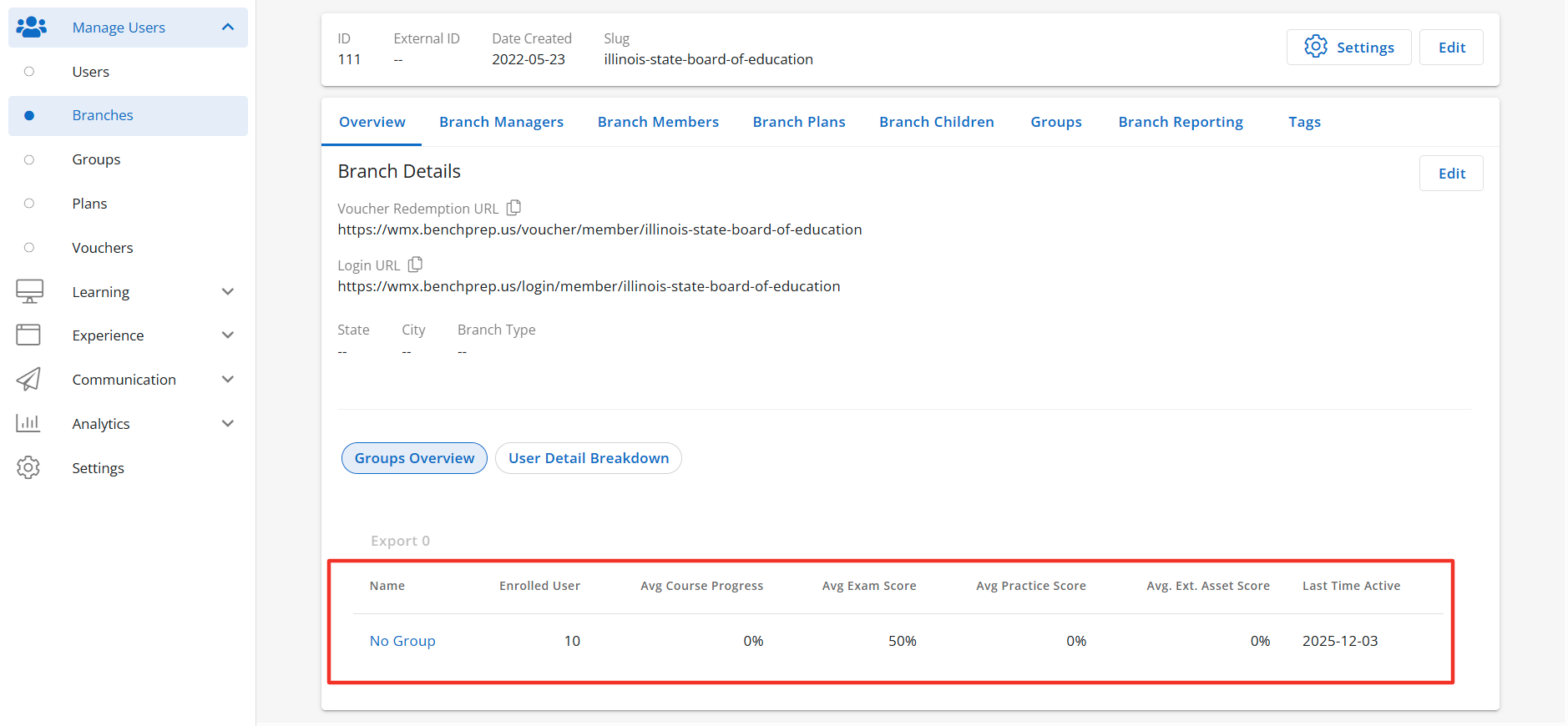 Note: Branch Details includes 4 sub-features designed to further personalize BenchPrep Analytics in Console. These features are listed below and can only be managed at the Branch level.