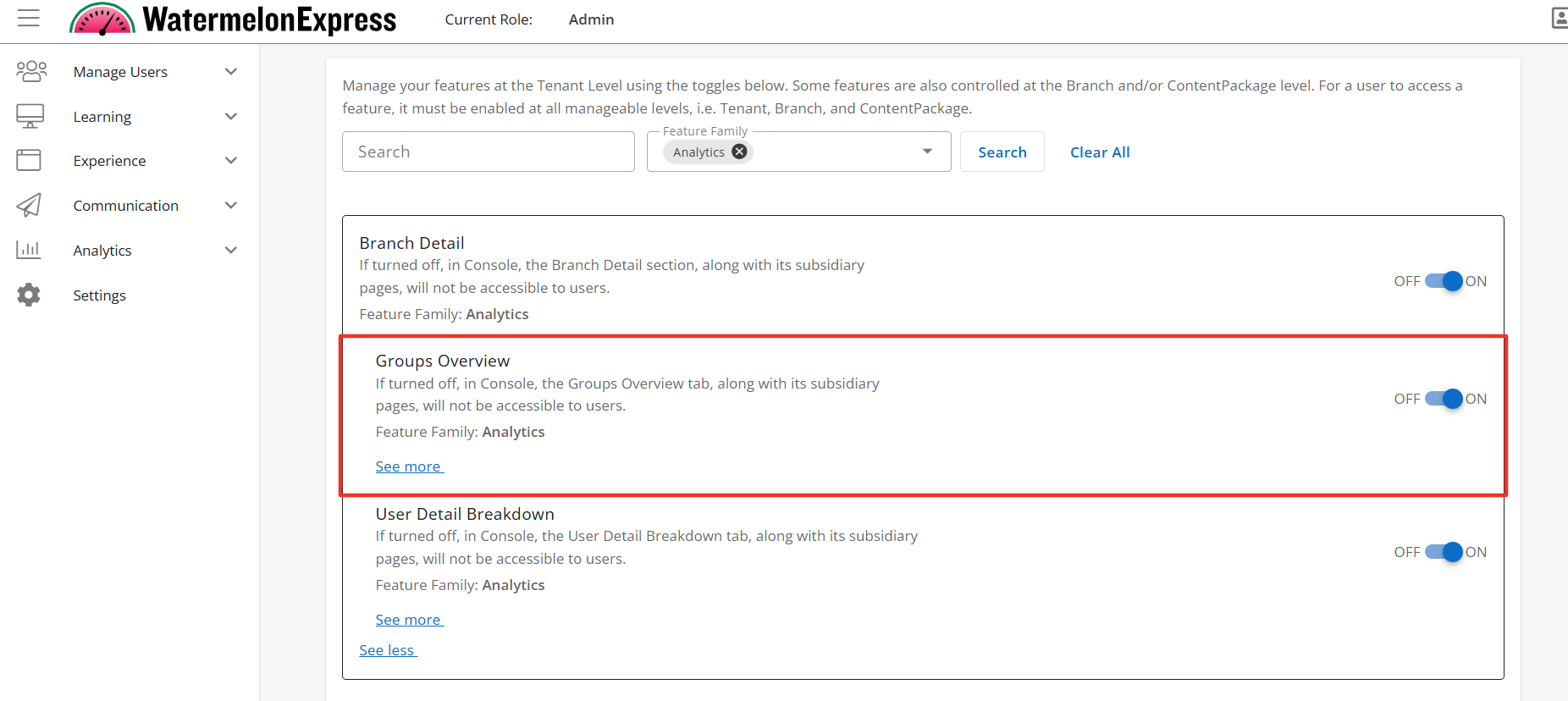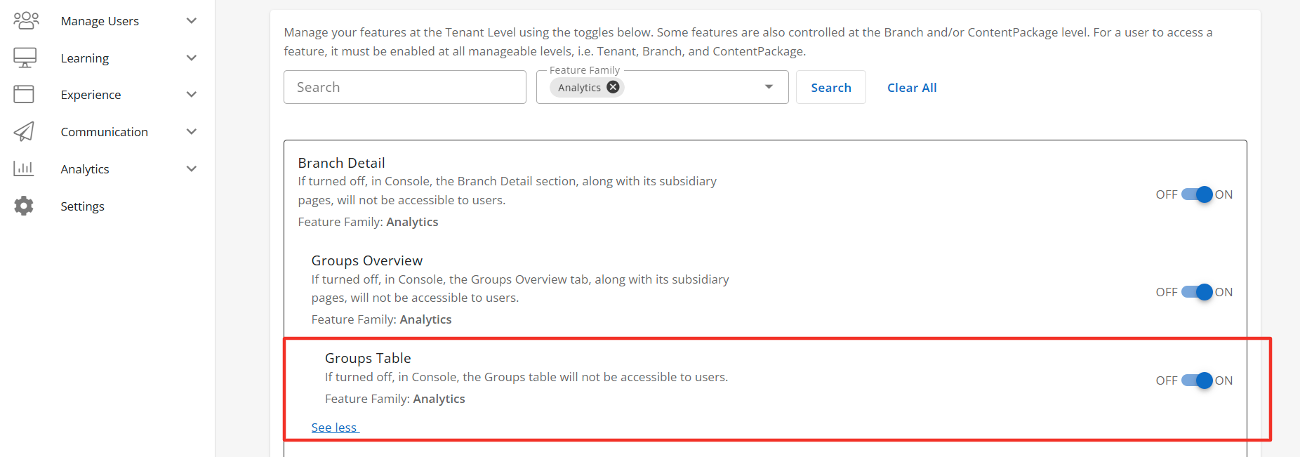 Description: When the Group Overview tab is enabled the sub-feature access Groups Table will display to users with the correct access context. Default State: ON