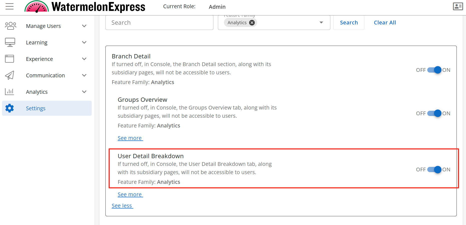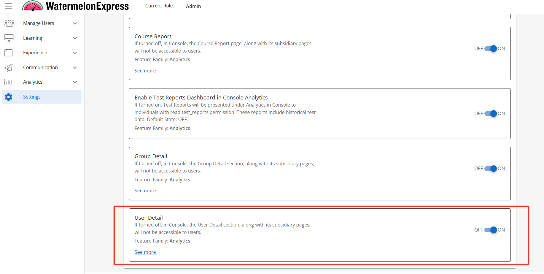 Description: When enabled in Console the User Detail Breakdown tab, along with its subsidiary pages, will be accessible to users with the correct access context. Default State: ON
