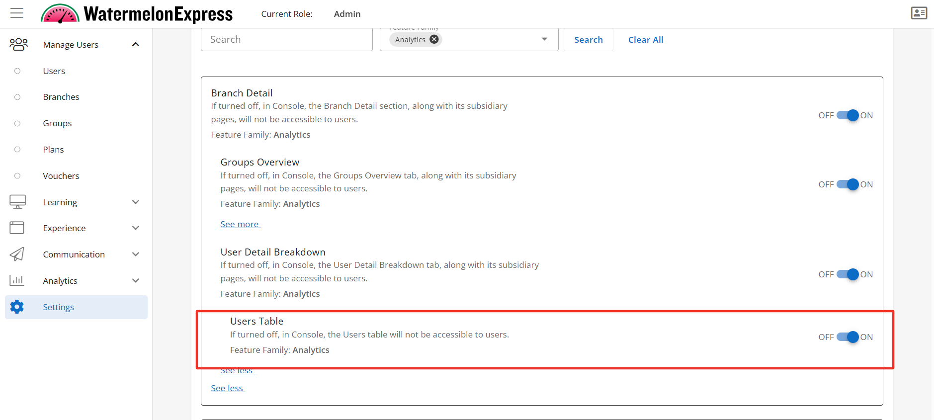 Description: The Users Table is a sub feature of the Users Tab. When enabled the User Tab section will display the Users Table to users with the correct access context. Default State: ON