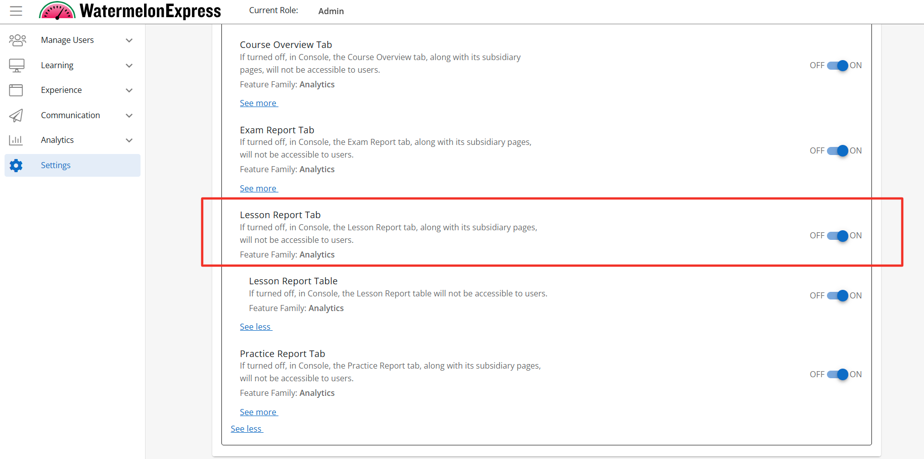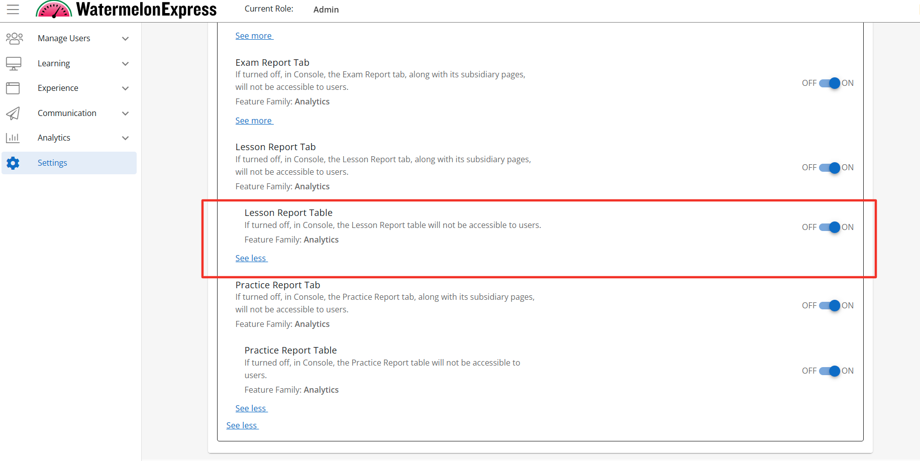 Description: The Lesson Report Table is a sub feature of the Lesson Report Tab. When enabled the Lesson Report section will display the Lesson Report Table to users with the correct access context. Default State: ON