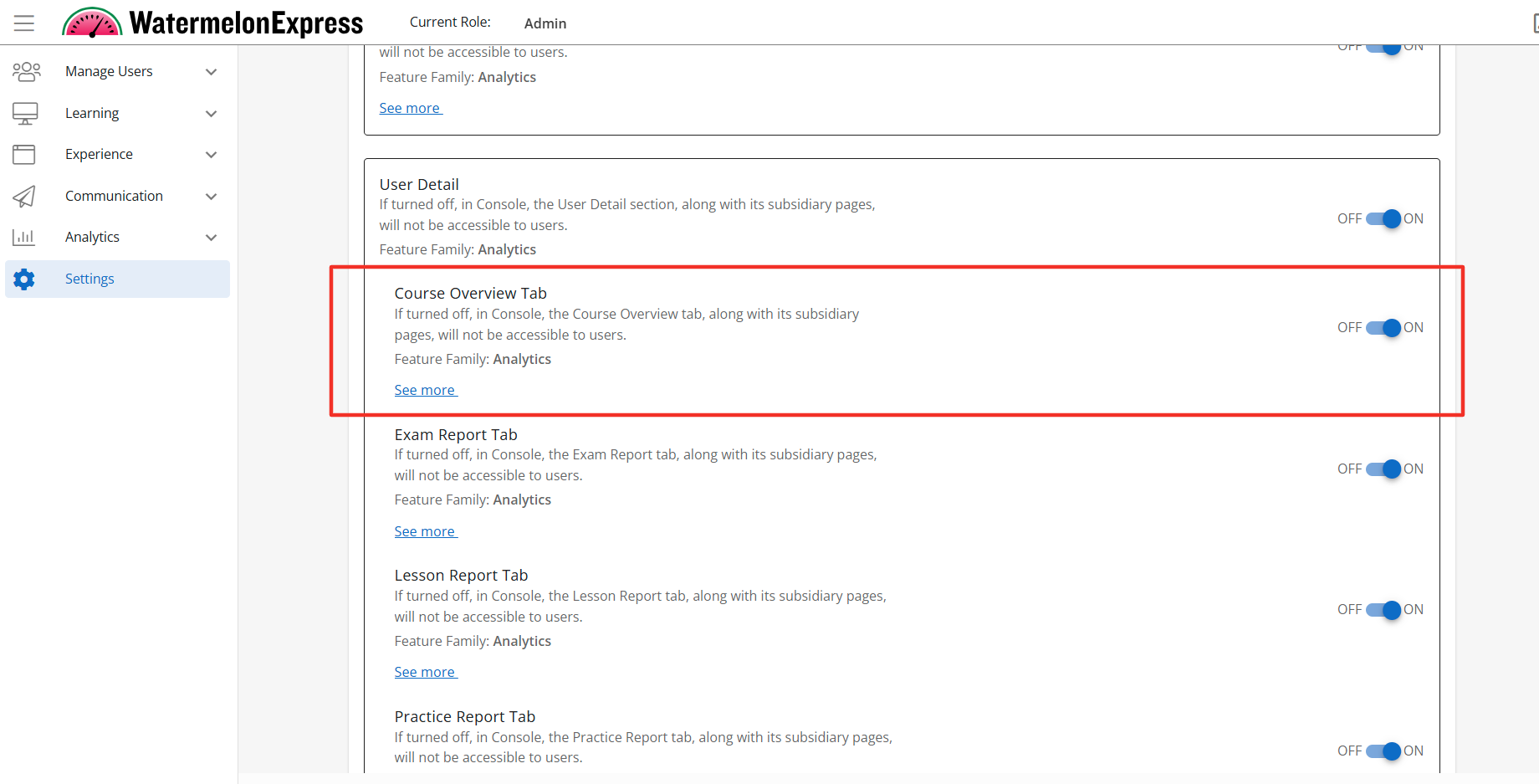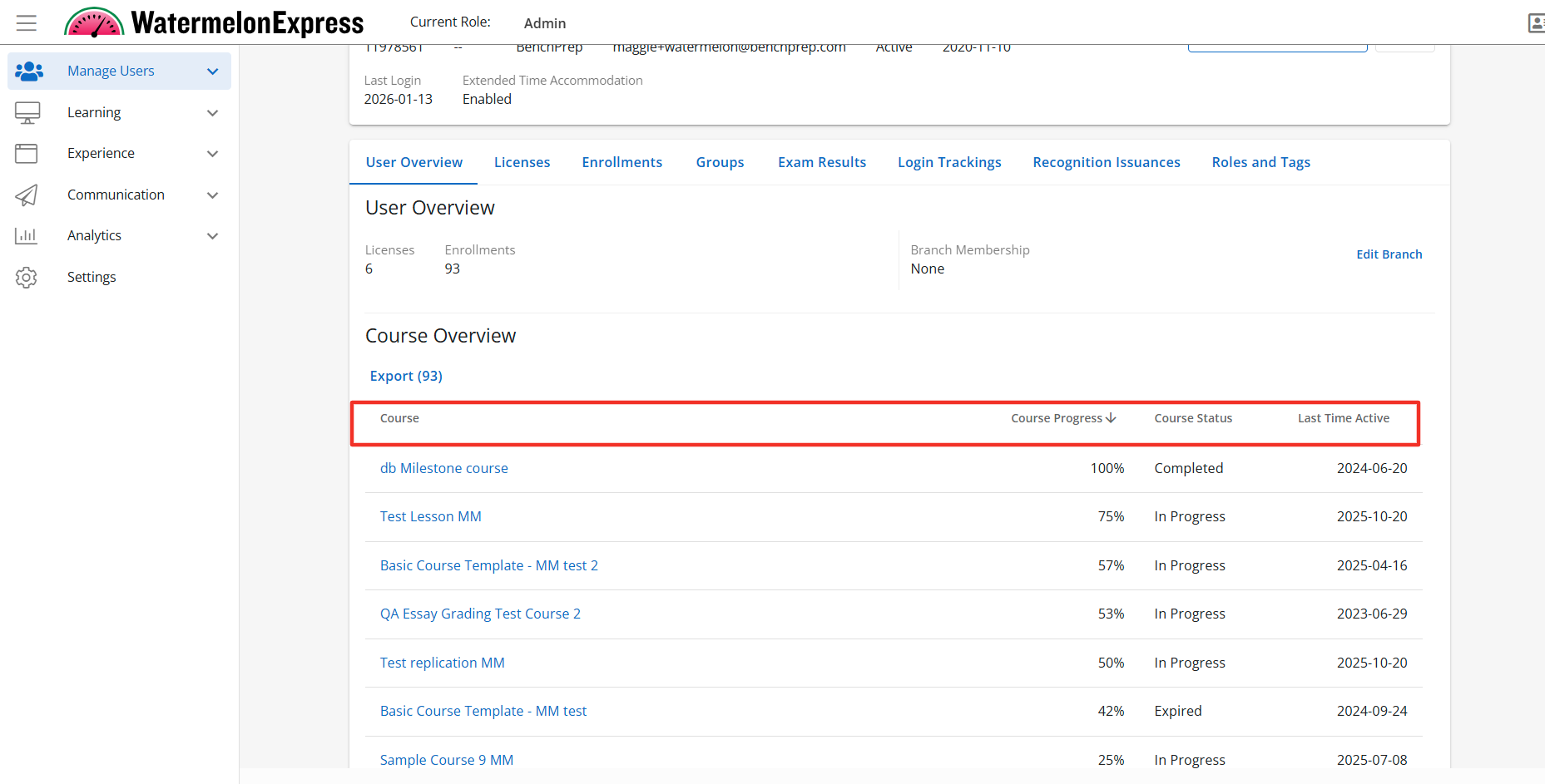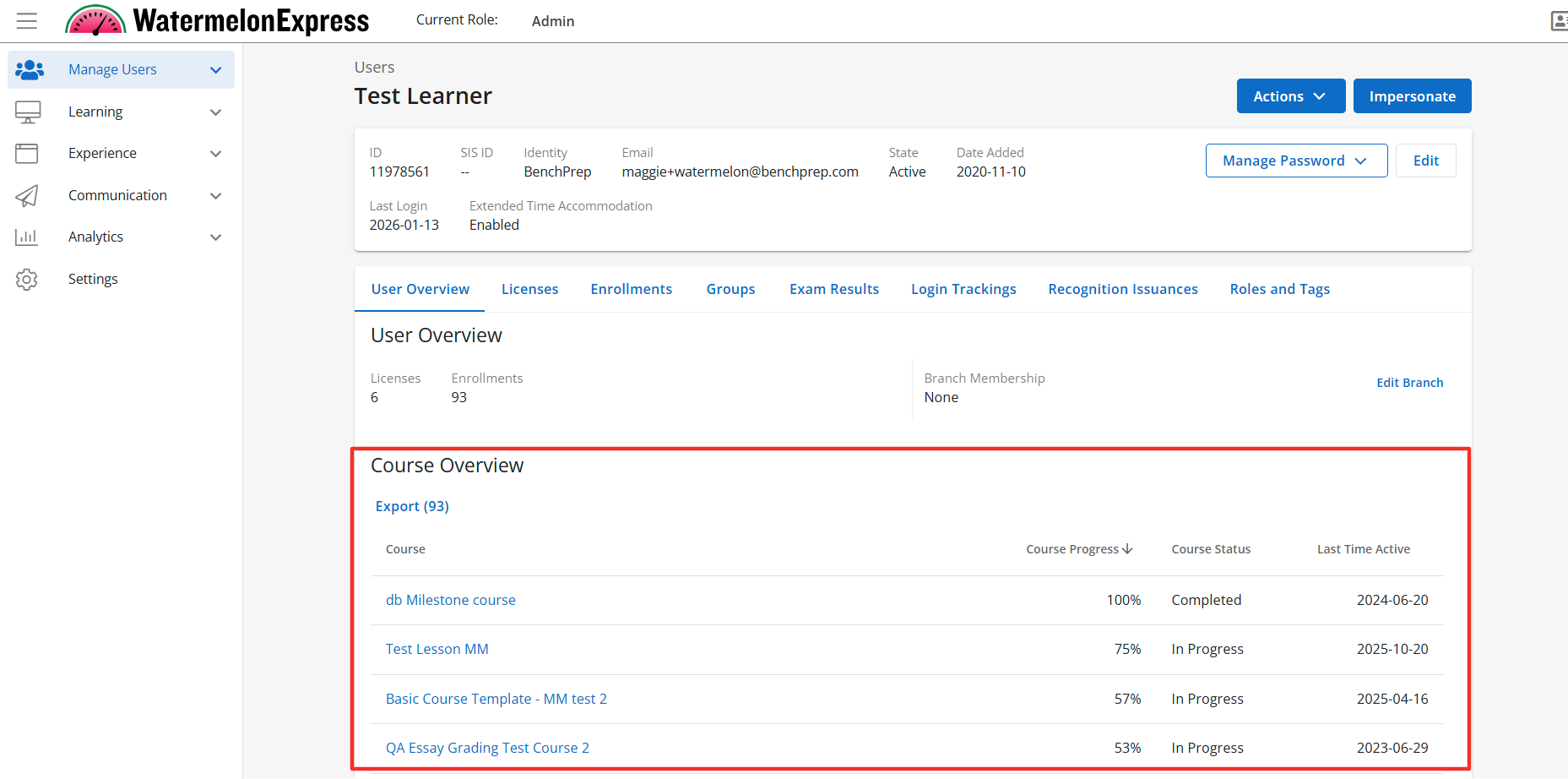 Description: The Course Overview Tab is a sub-feature of the User Detail feature. When the Course Overview tab is enabled the User Details section will display the Course Overview Tab, along with its subsidiary pages. The Course Over Tab is accessible to users with the correct access context. Default State: ON
