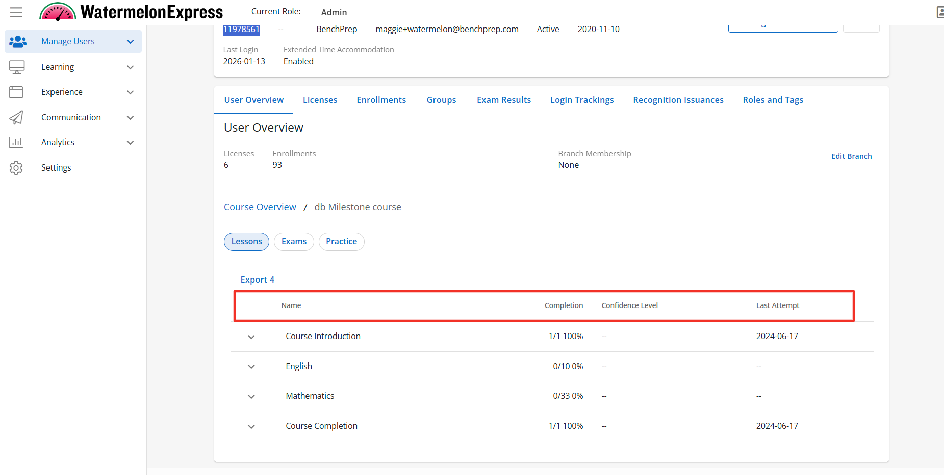 Note: User Details includes 8 sub-features designed to further personalize BenchPrep Analytics in Console. These features are listed below and can only be managed at the User level.
