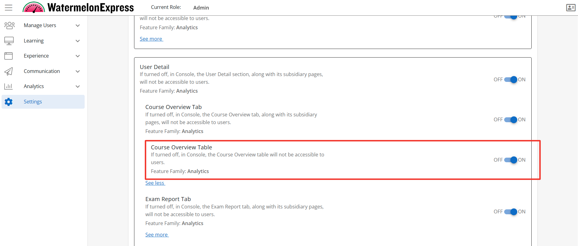 Description: The Course Overview table is a sub-feature of the Course Overview Tab. When the Course Overview Tables is enabled the Course Over Table will display to users with the correct access context. Default State: ON