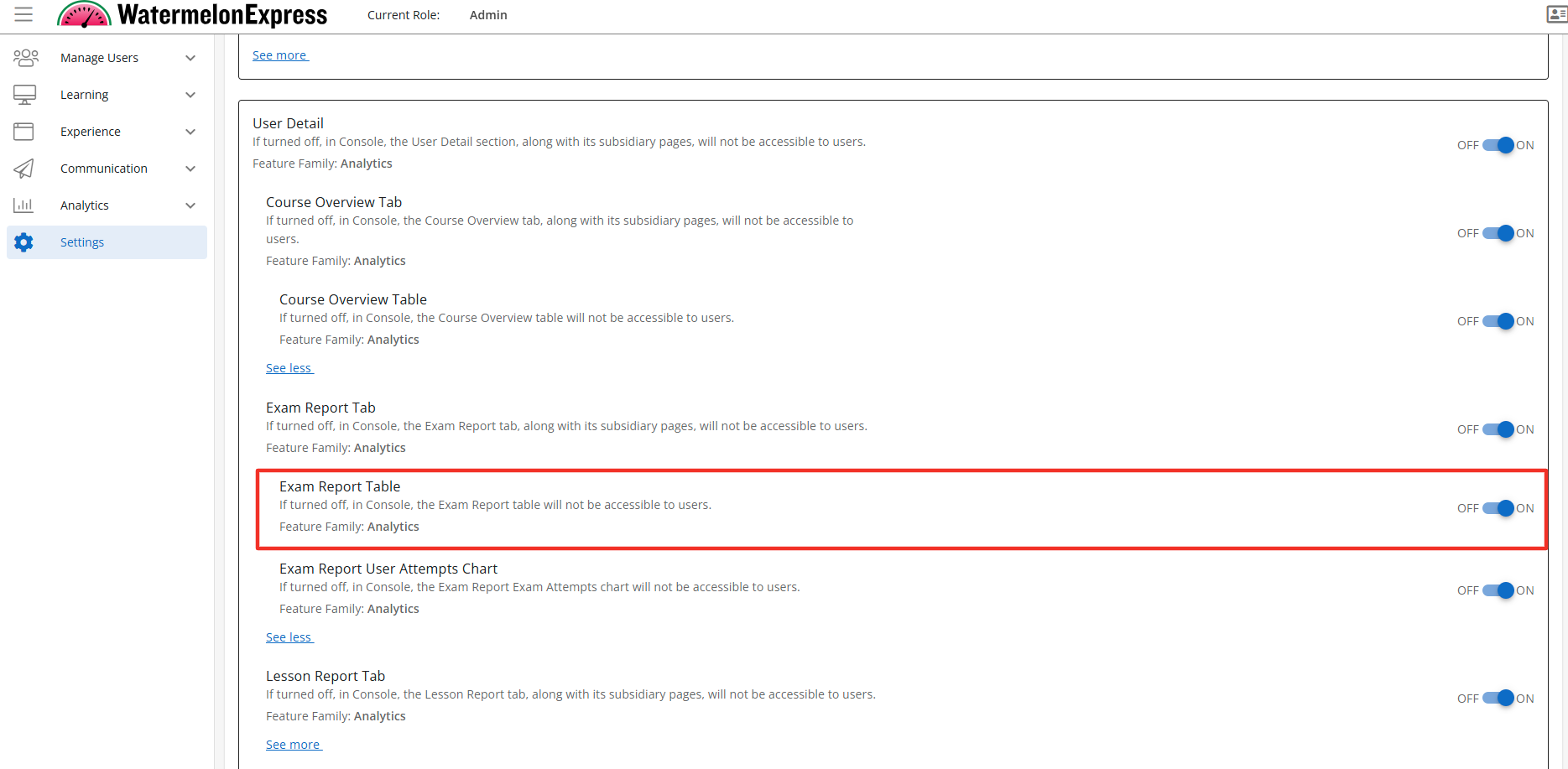 Description: The Exam Reports Table is a sub-feature of the Exam Reports Tab. When enabled the Exam Reports Tab section will display the Exam Report Table to users with the correct access context. Default State: ON