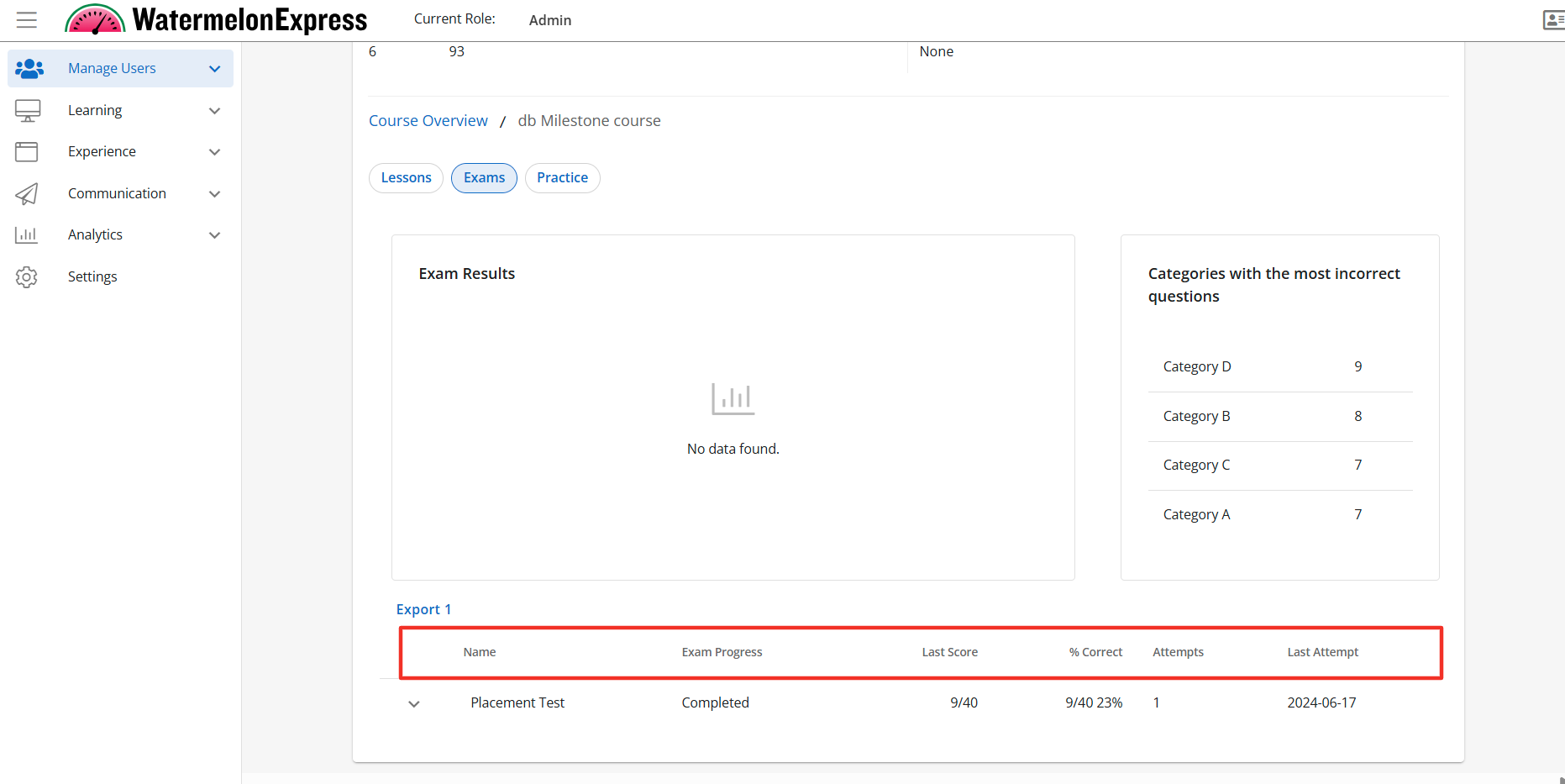Description: The Exam Report tab is a sub-feature of the User Detail feature and appears once you have selected a course from the Course overview page. When enabled the User Details section will display the Exam Report, along with its subsidiary pages. The Exam Report tab is accessible to users with the correct access context. Default State: ON